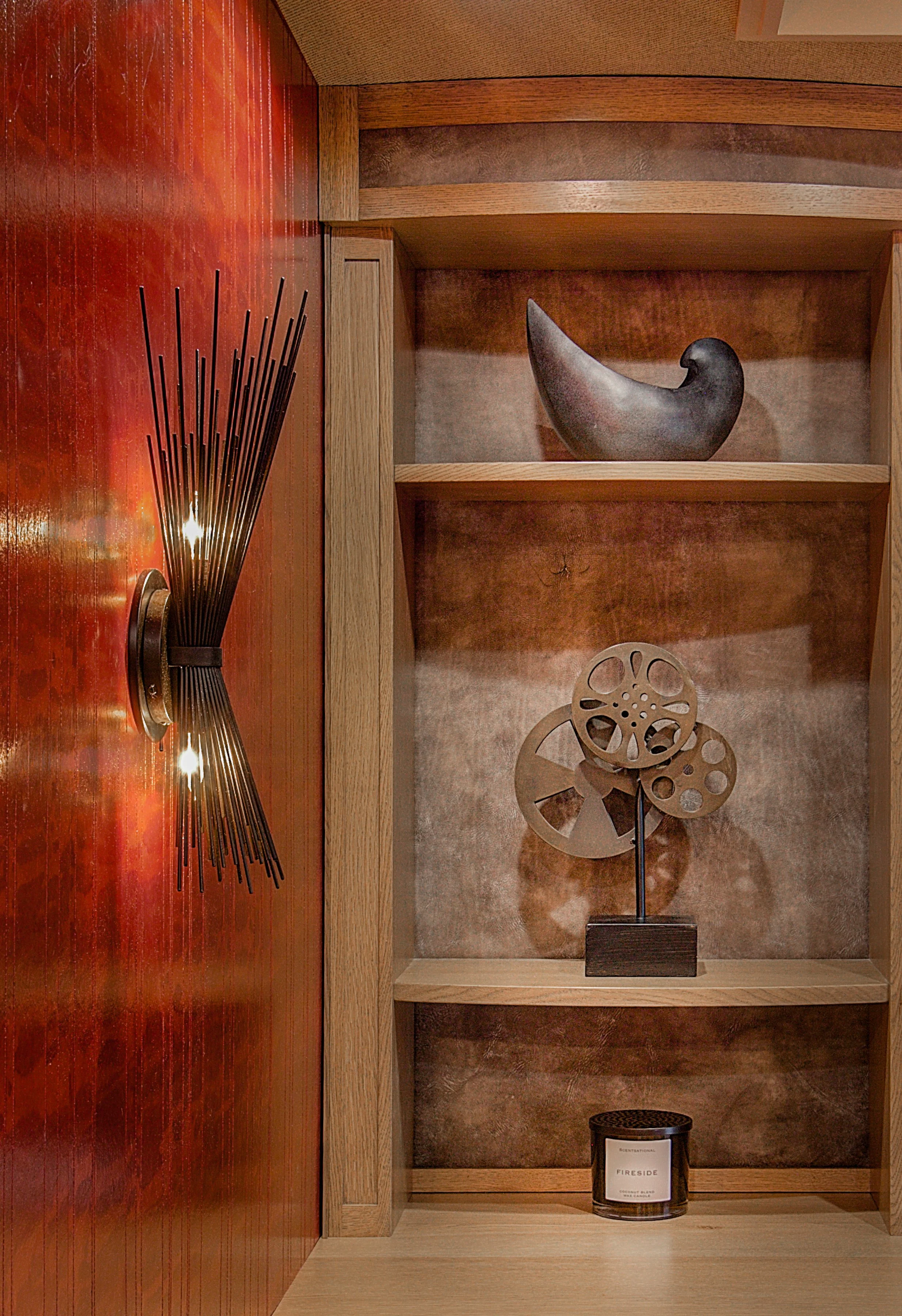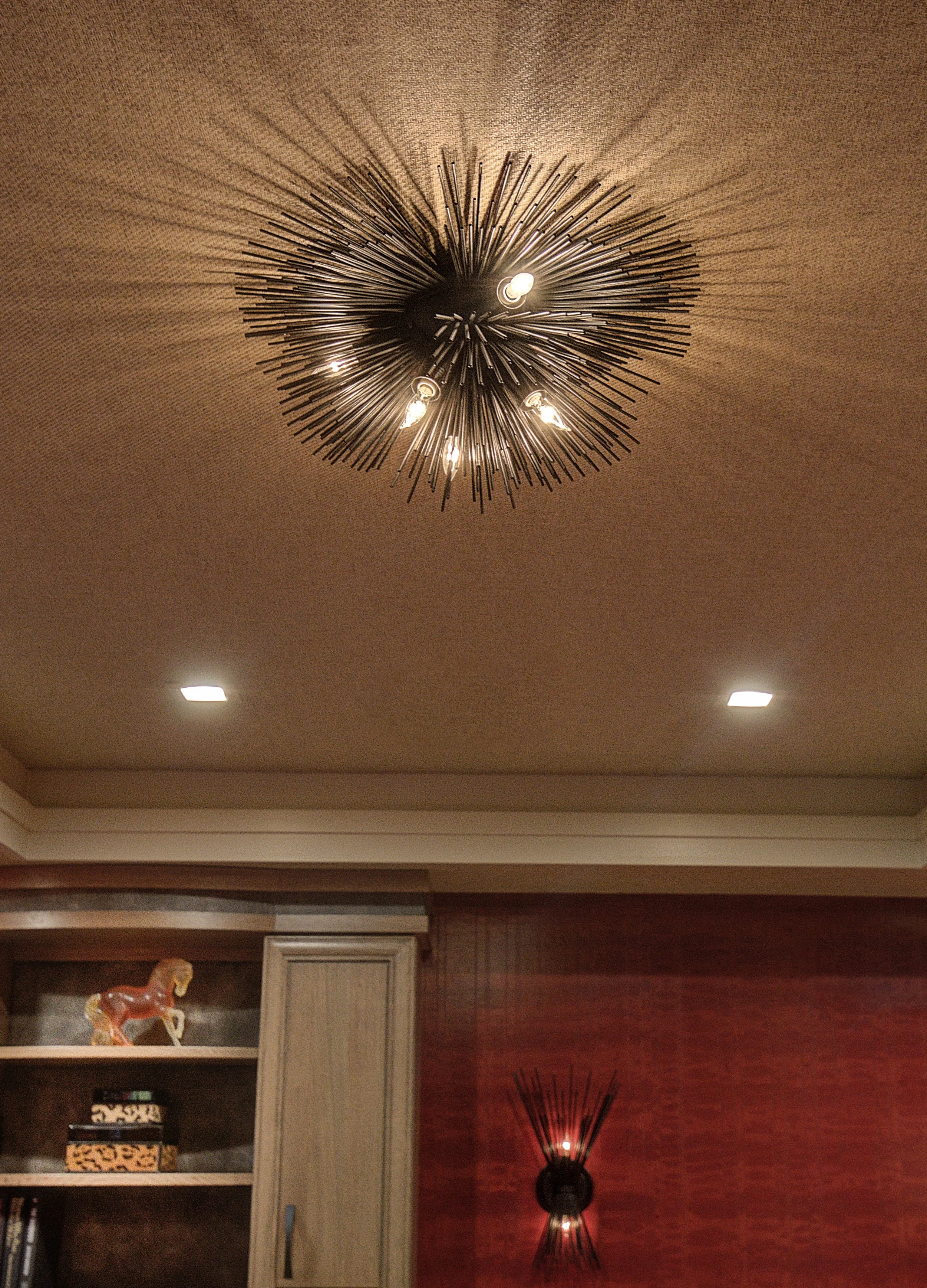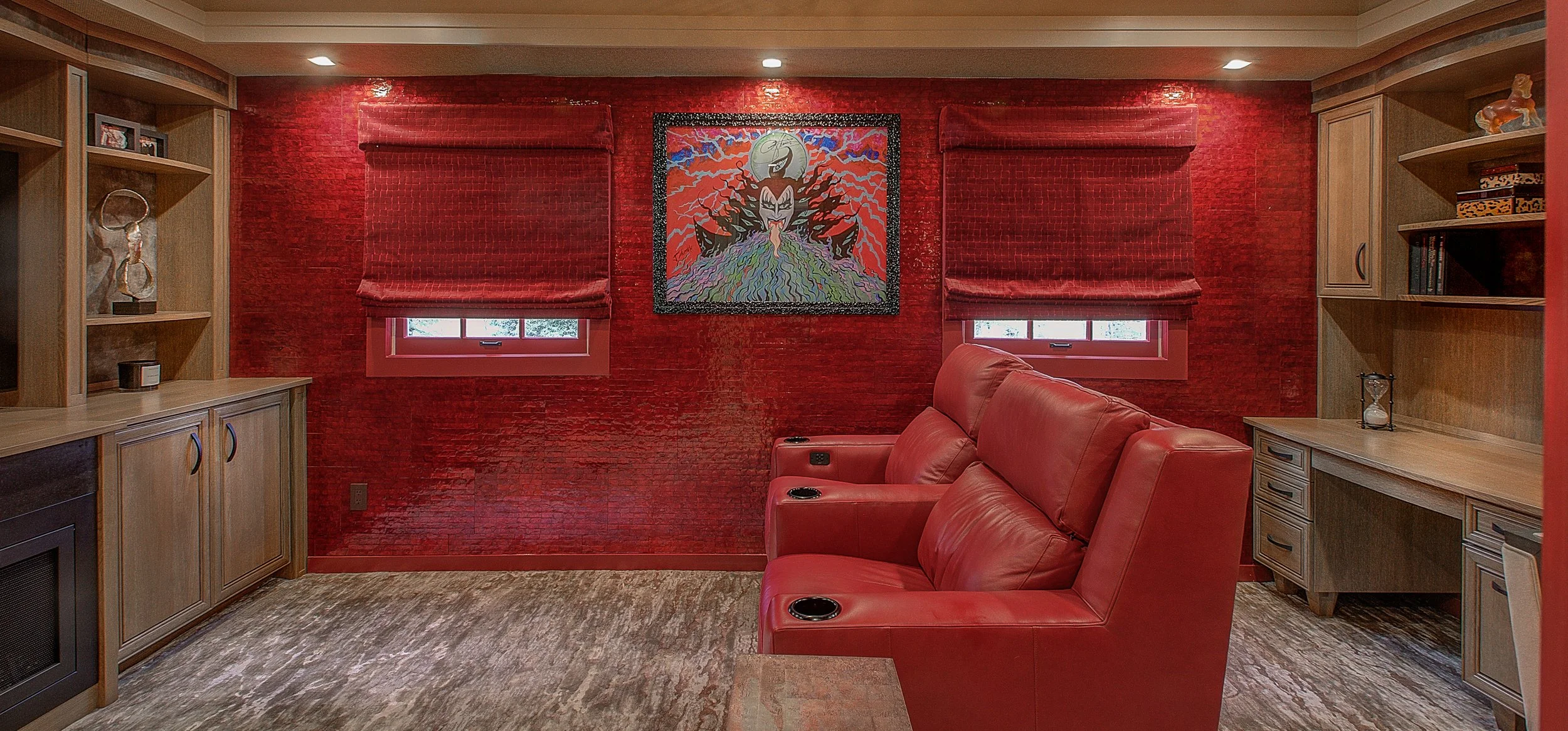 We started with the room I affectionately call “The Red Room.” The husband and wifeWe needed a place to kick back and relax, watch movies, check emails and have a glass of merlot. Together, we repurposed We nabbed an unused bedroom, gutted it to the studs, and went to town with a built in media center ,and ventless fireplace, coordinating desk, reclining theatre seating in red leather (complete with cup holders), and a “hers” area with a plush velvet sofa. Inspo came from artwork of the KISS band. When she showed me the painting of Gene Simmons, she said, “It doesn’t have to stay,” to which I emphatically replied, “oh, but it does.” And then I decided to run with the red. On the “Gene” wall, I found one of my favorite products of late: a red wall covering by the incredibly talented house of Maya Romanoff. The wall covering is made entirely from mother of pearl shells! I paired that with a red “baseball” stitch wallpaper on adjacent walls, which includes a motif of water stains that appear to run down the wall. Bold designs need areas of calm for contrast, so I placed a neutral and matte black organic textural covering on the ceiling, and added neutral elements of walnut with rounded crown moldings for all built ins, which also include leather panel accents.