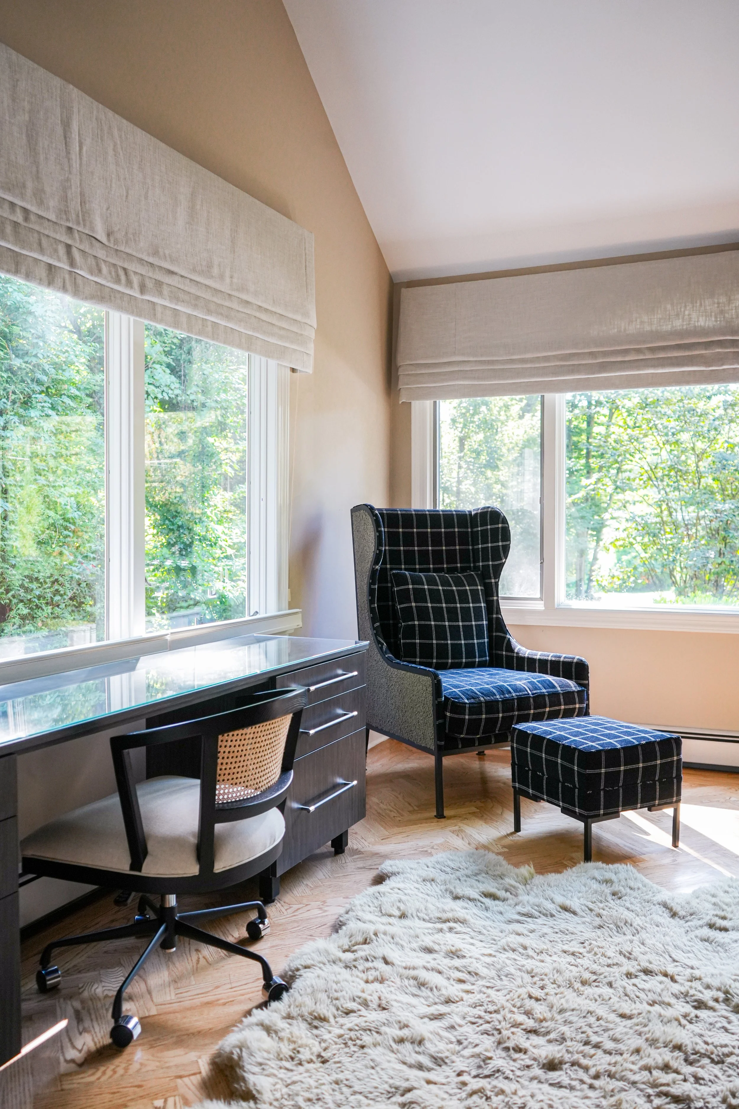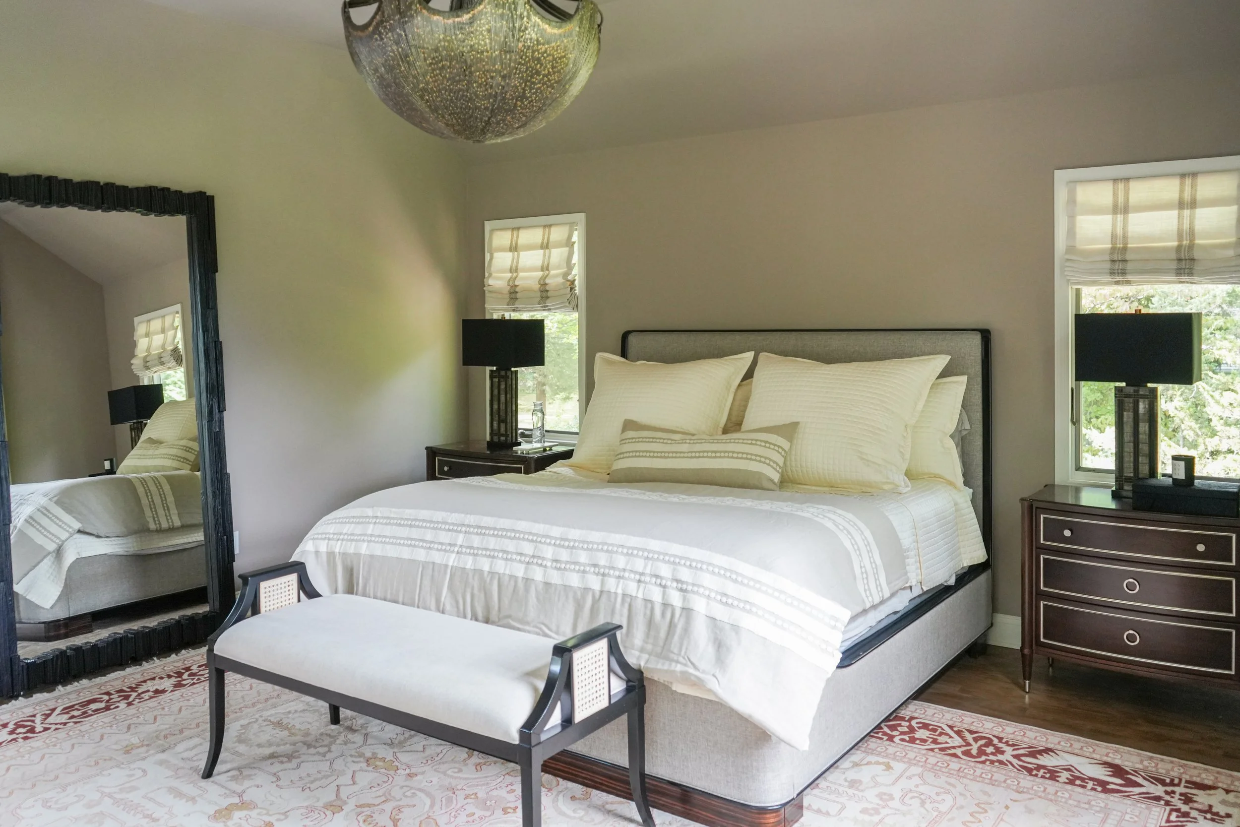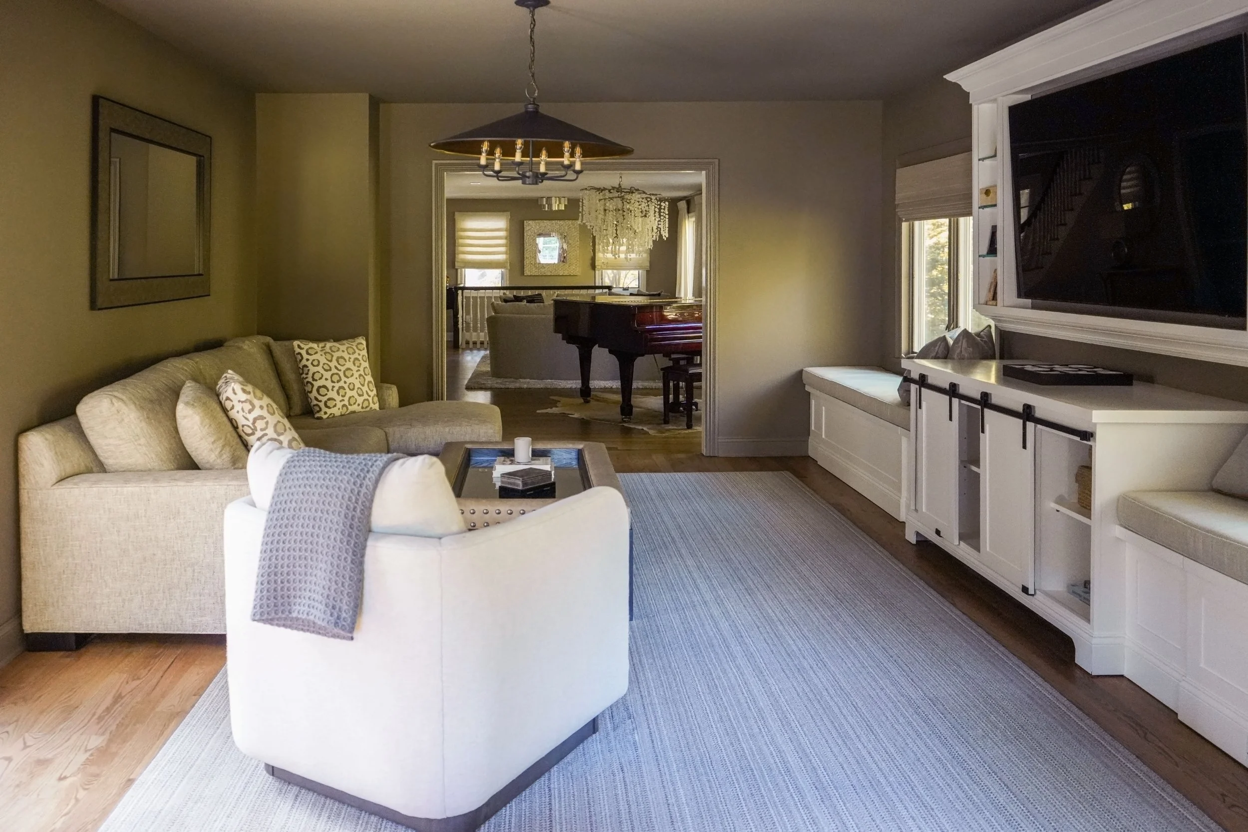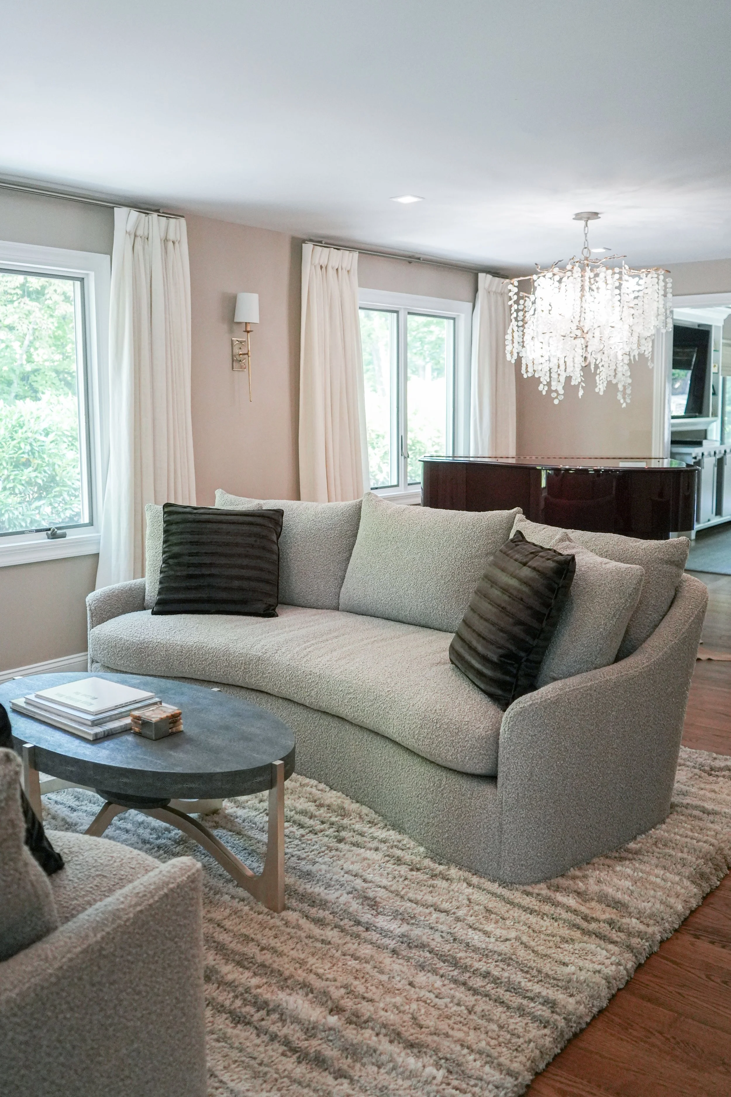 We love working with this fun and bustling family of five (plus pets!) on their rambling home in the woods. Set against a verdant background of trees, spacious lawn, and pool grounds, this home had great bones but no furniture. The project started when we were called by the builder to help with a bath remodel, but ultimately grew into us designing every living space from the primary suite to the family living spaces, to the exterior kitchen, and patios beyond.