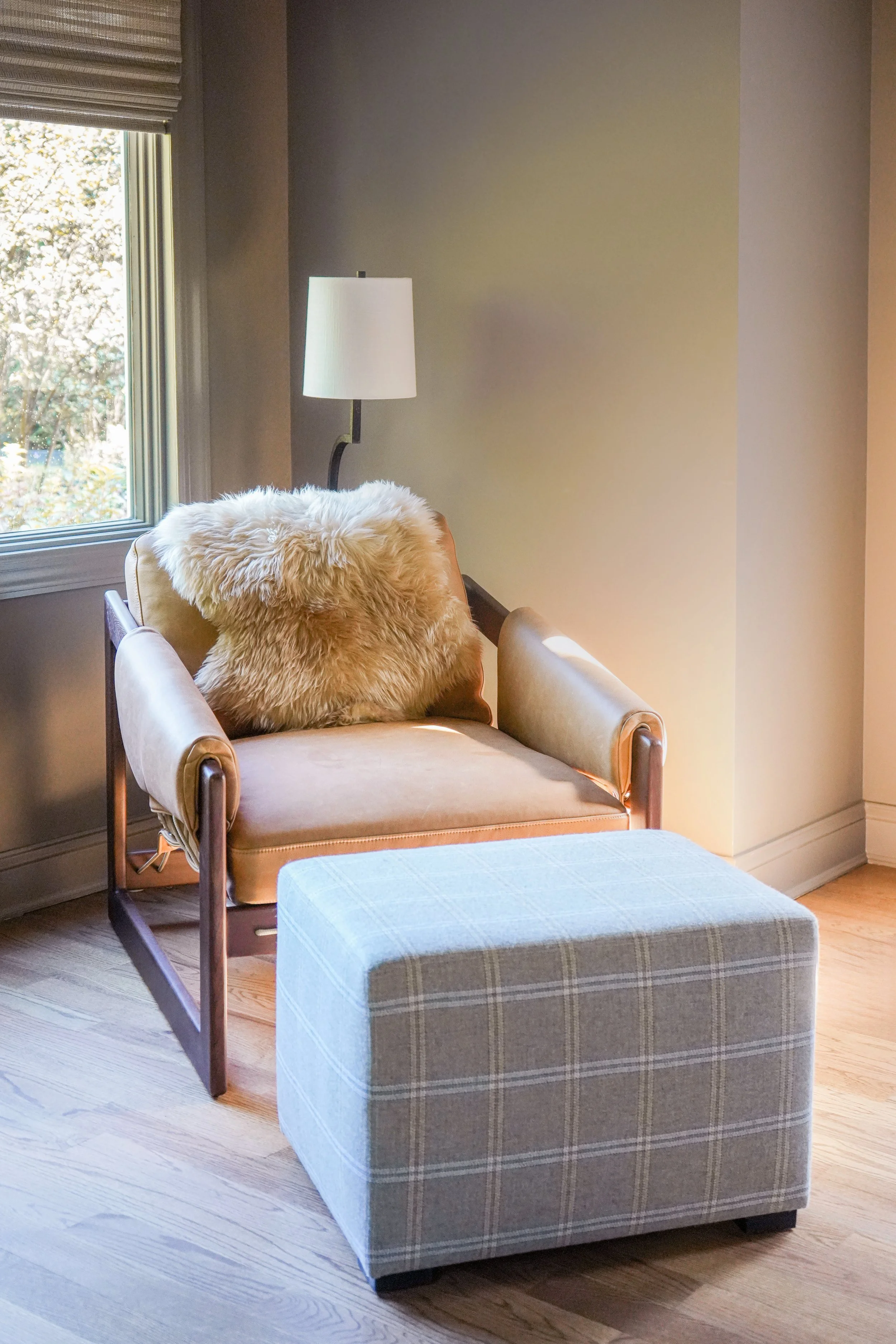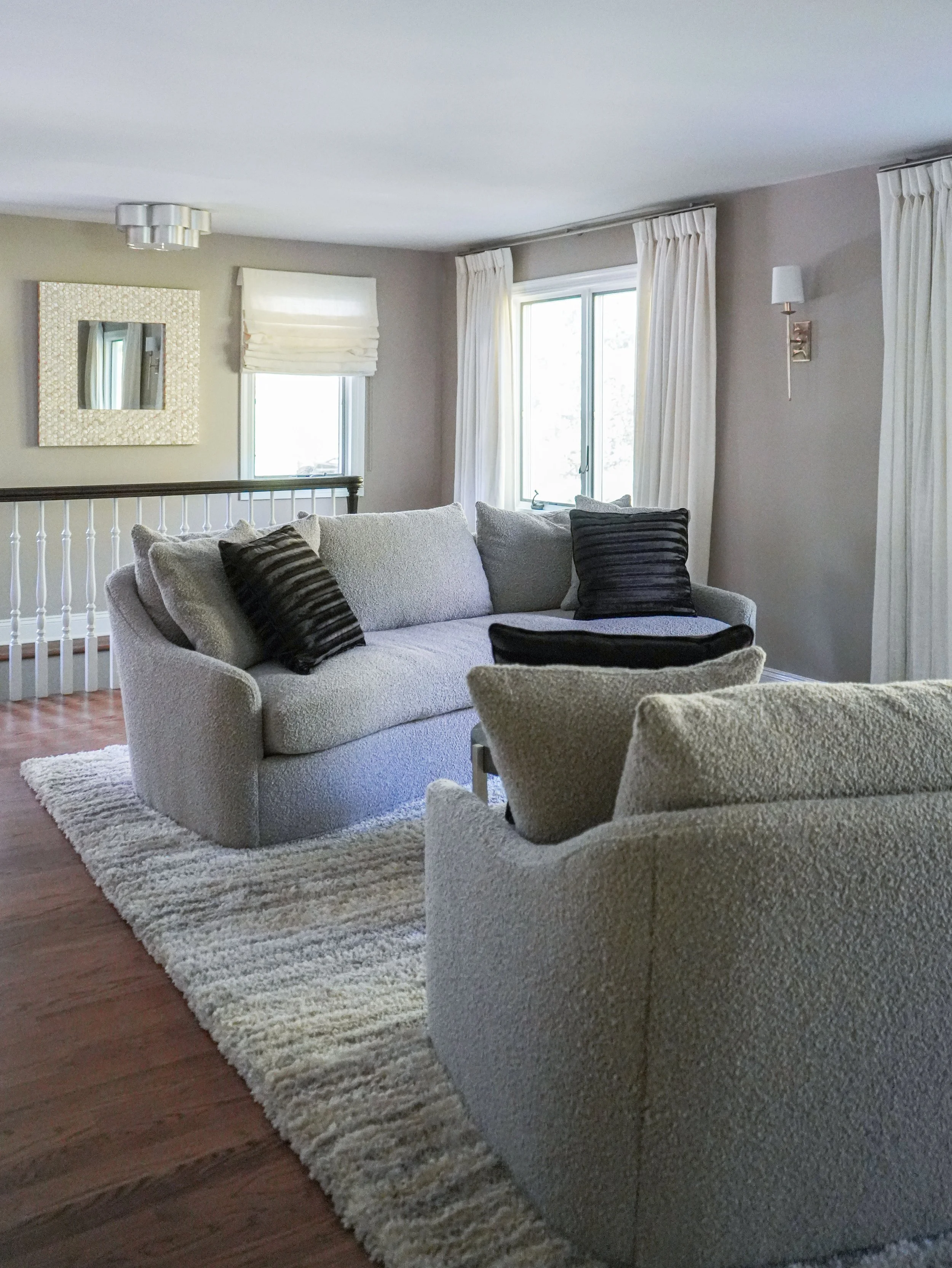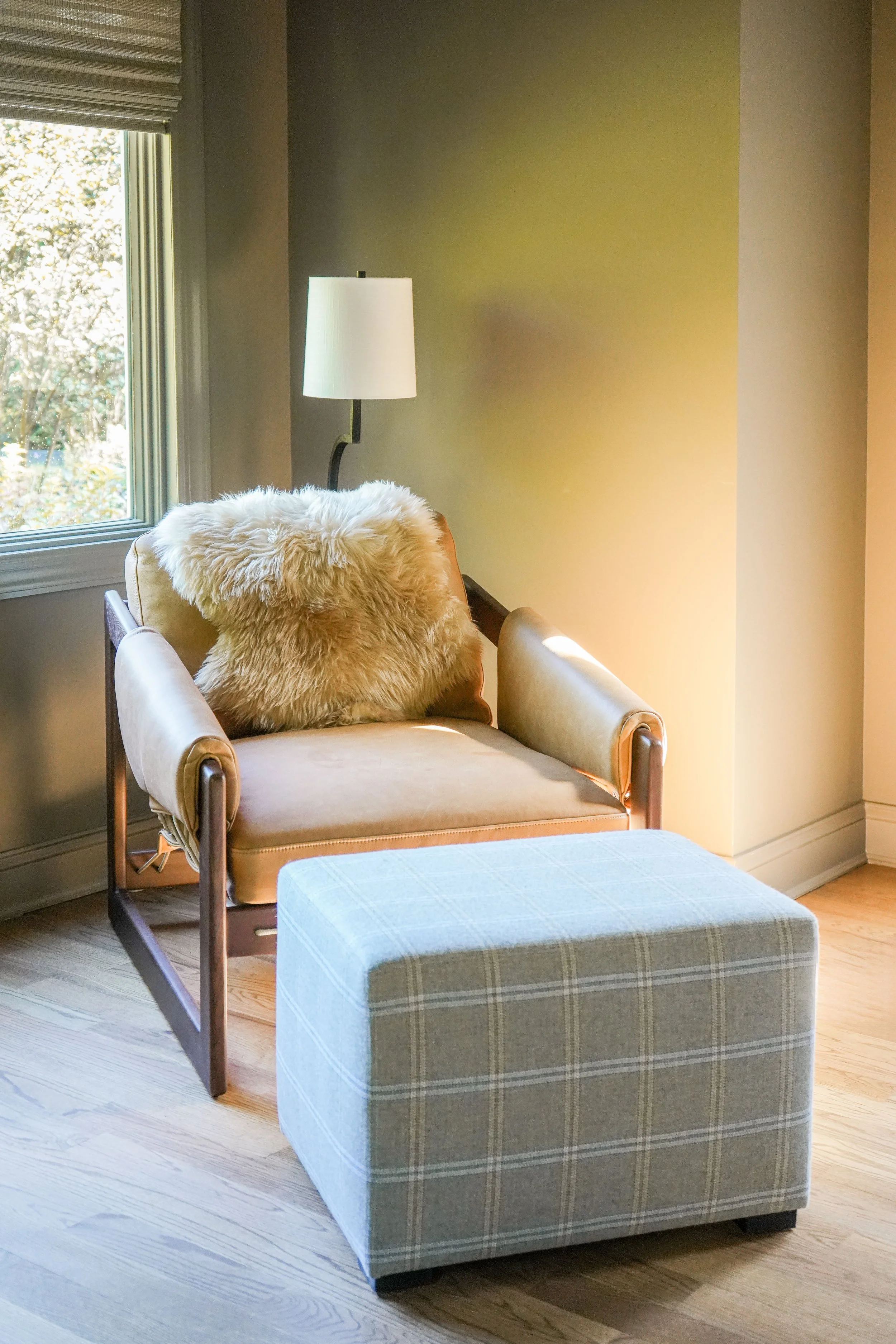 This family needed plenty of lounging for three college-aged kiddos and their folks, with a durable yet stylish vibe. We aimed for cozy and warm to complement both the surrounding property and the client's personality. Texture abounds, with leather, boucle, fur and hide, and wool plaids. We used accents of iron in the more rustic den, but in the adjoining living room, we went dressy and divine with champagne tones and mother of pearl accents.
