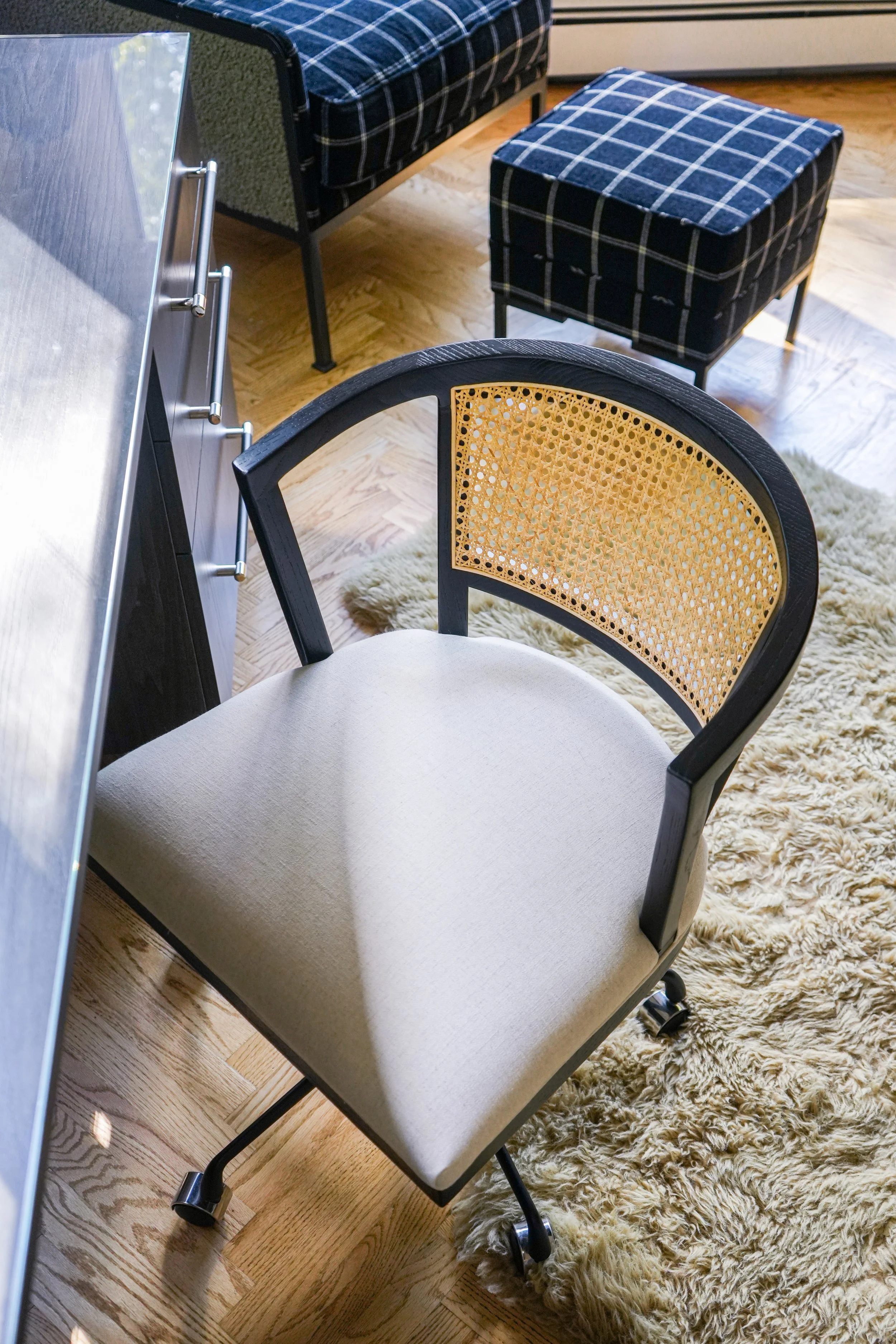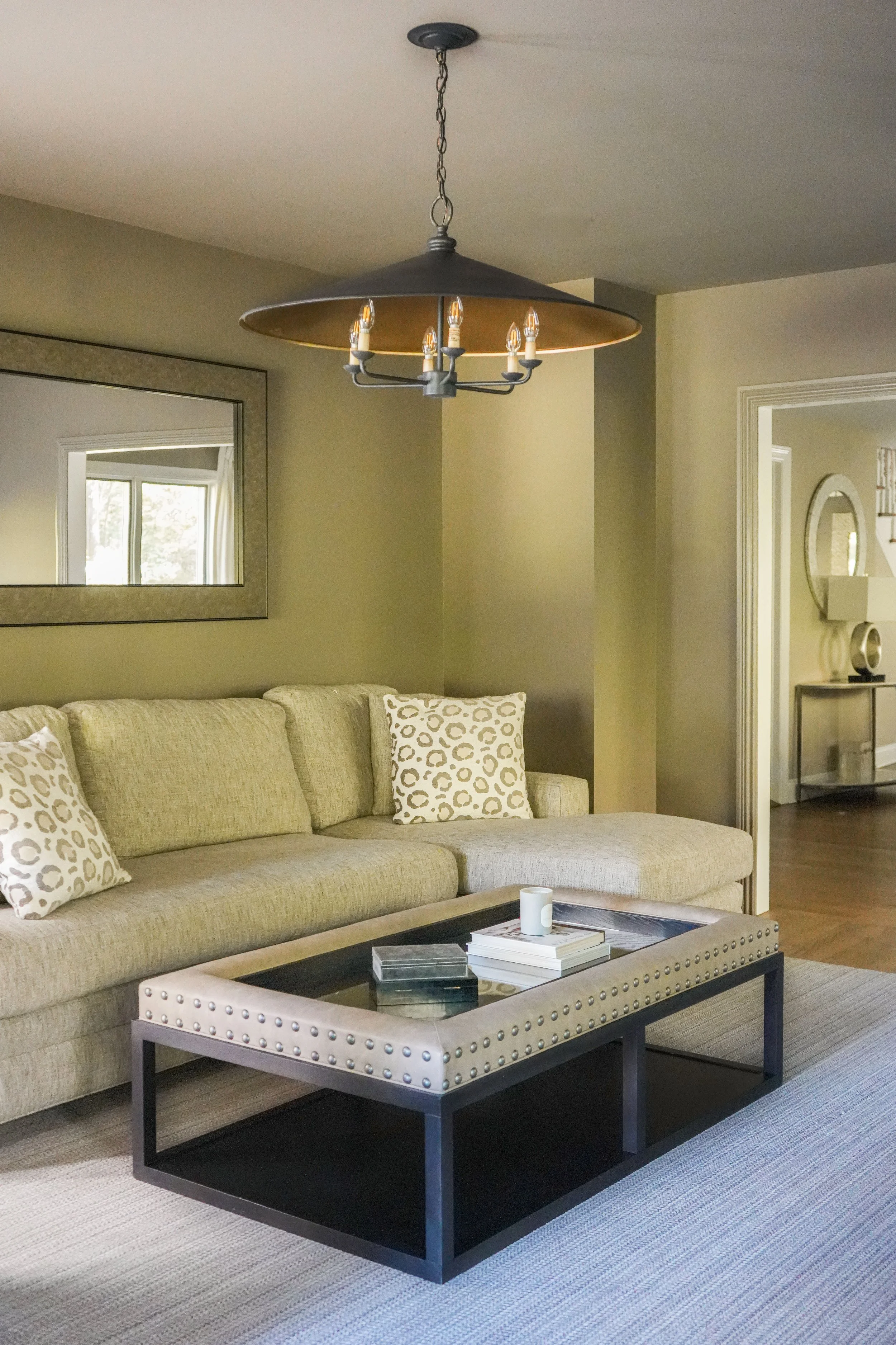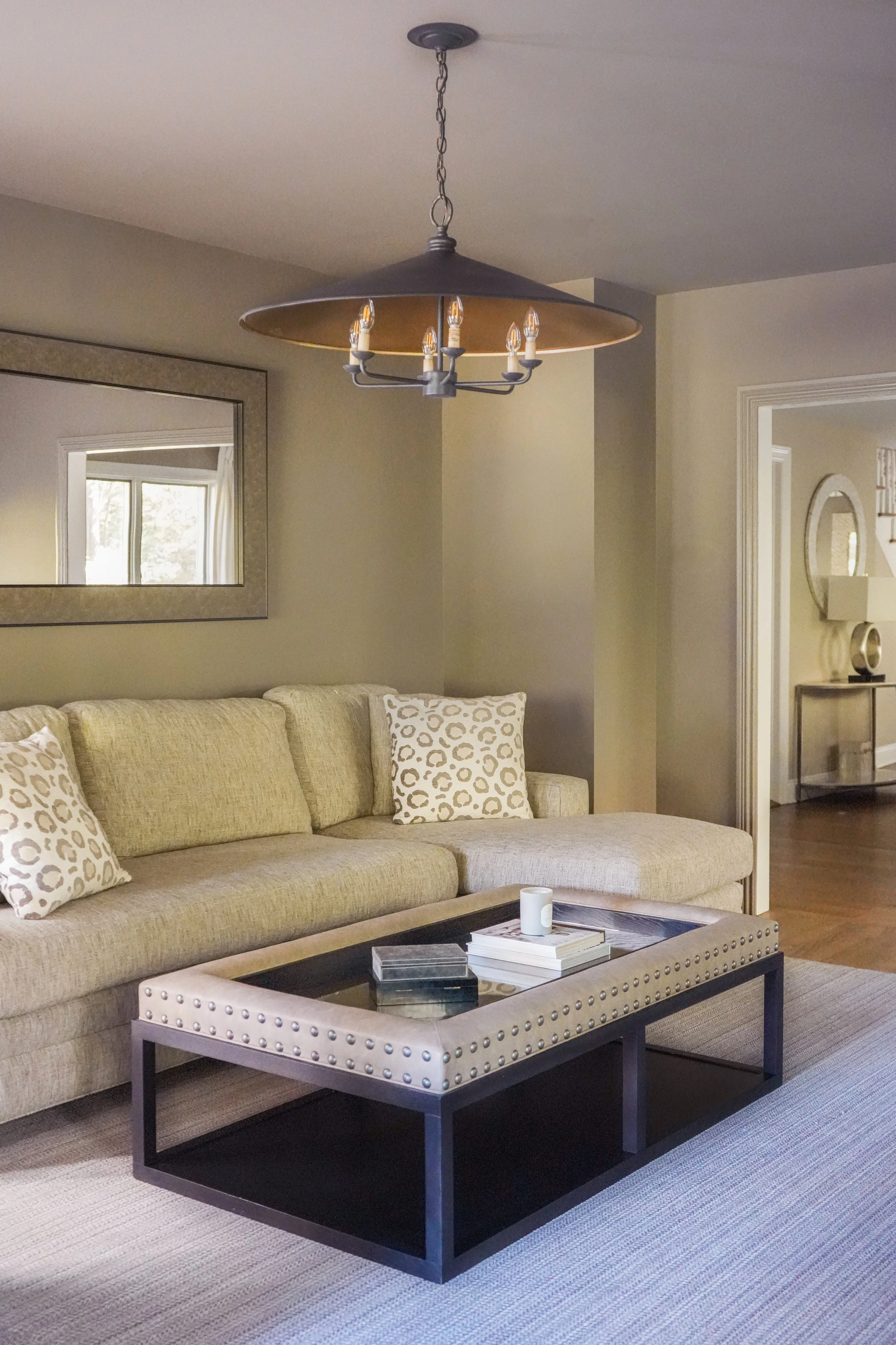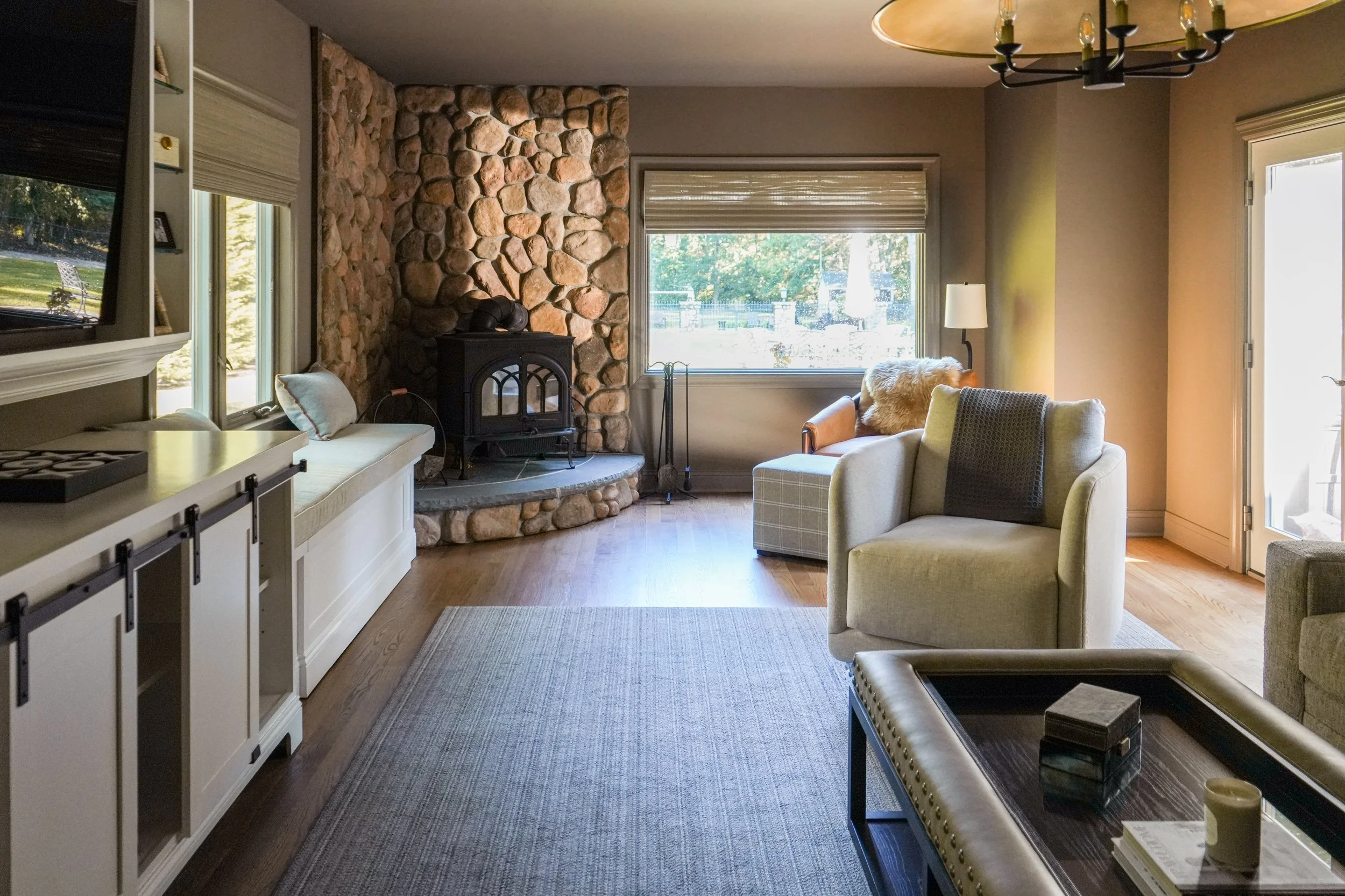 This family needed plenty of lounging for three college-aged kiddos and their folks, with a durable yet stylish vibe. We aimed for cozy and warm to complement both the surrounding property and the client's personality. Texture abounds, with leather, boucle, fur and hide, and wool plaids. We used accents of iron in the more rustic den, but in the adjoining living room, we went dressy and divine with champagne tones and mother of pearl accents.