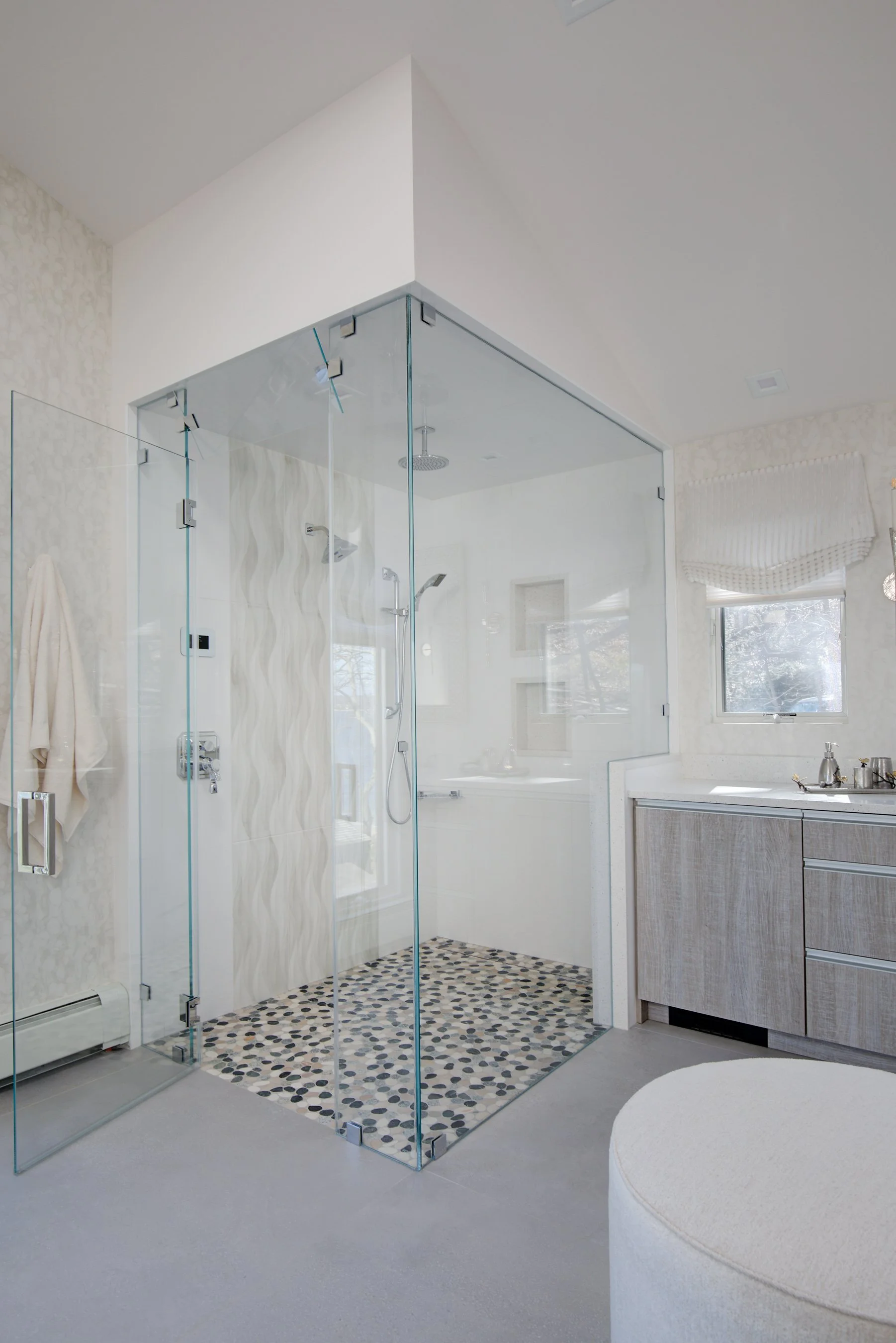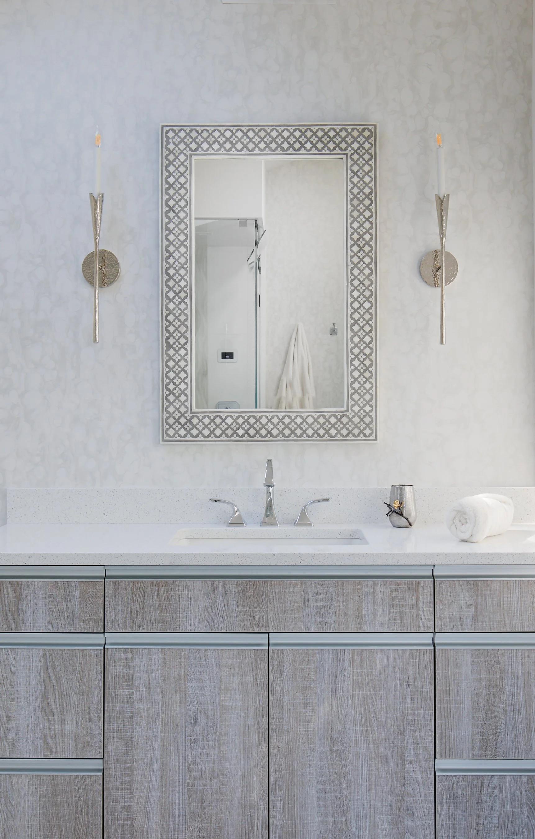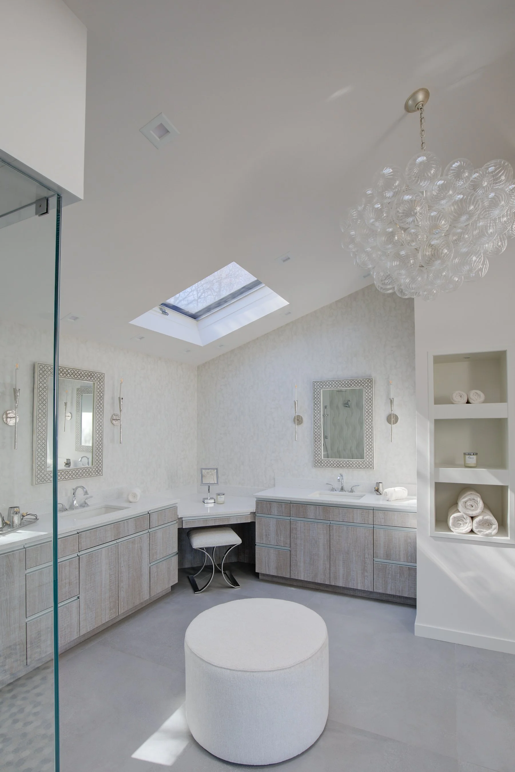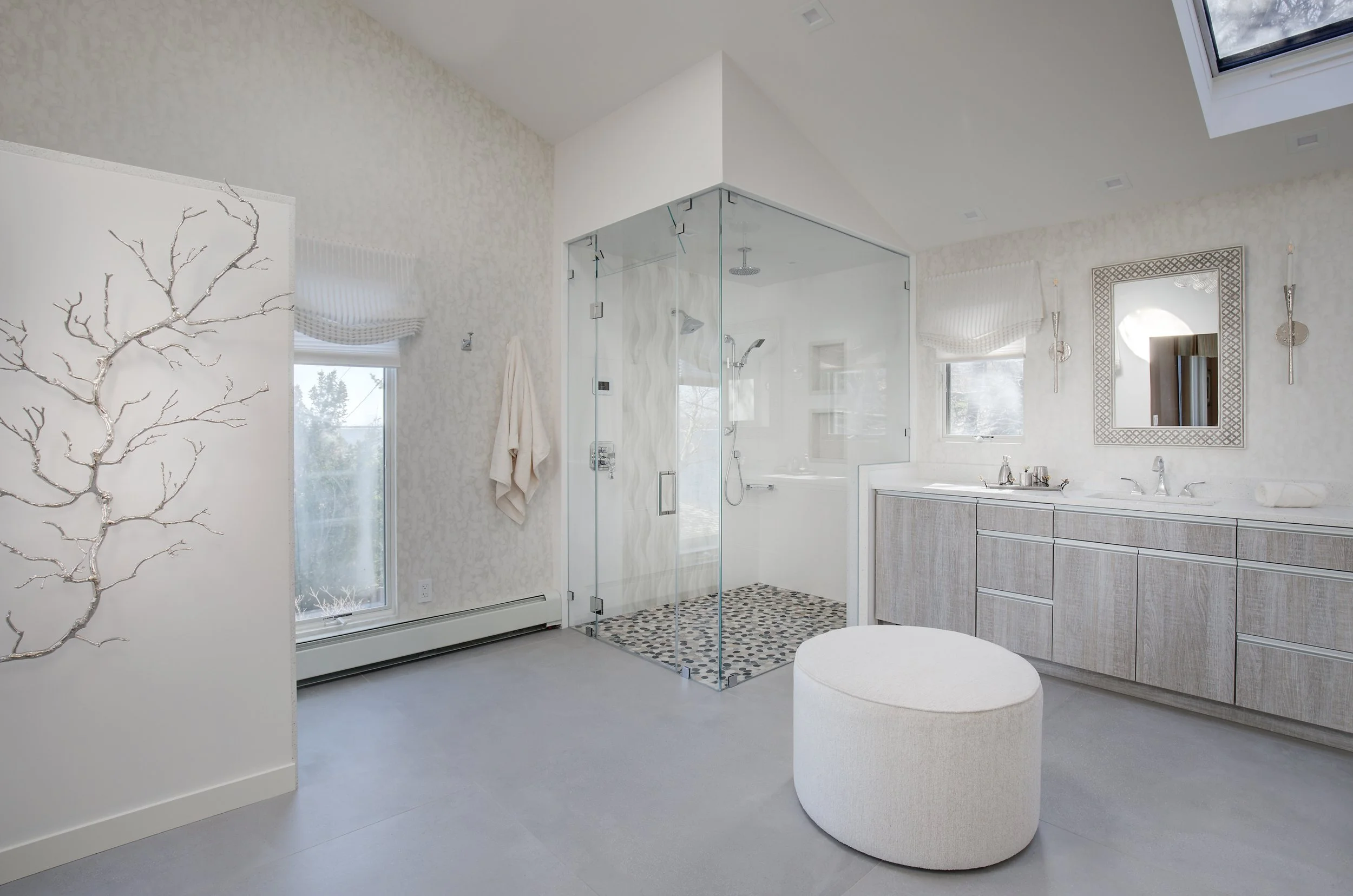 In the primary bath, the mauve jetted tub and tiny shower were replaced with a steam shower so the clients could soothe themselves after a fun day in the sun, complete with rainheads and touch controls. Commodious his and hers vanities are linked by a full makeup desk for her. Beach innuendos of rock style tile and waves on the walls are toned with a glamorous bubble chandelier and watercolor style wallcoverings in silver. A vine inspired silver branch sculpture graces the entrance.