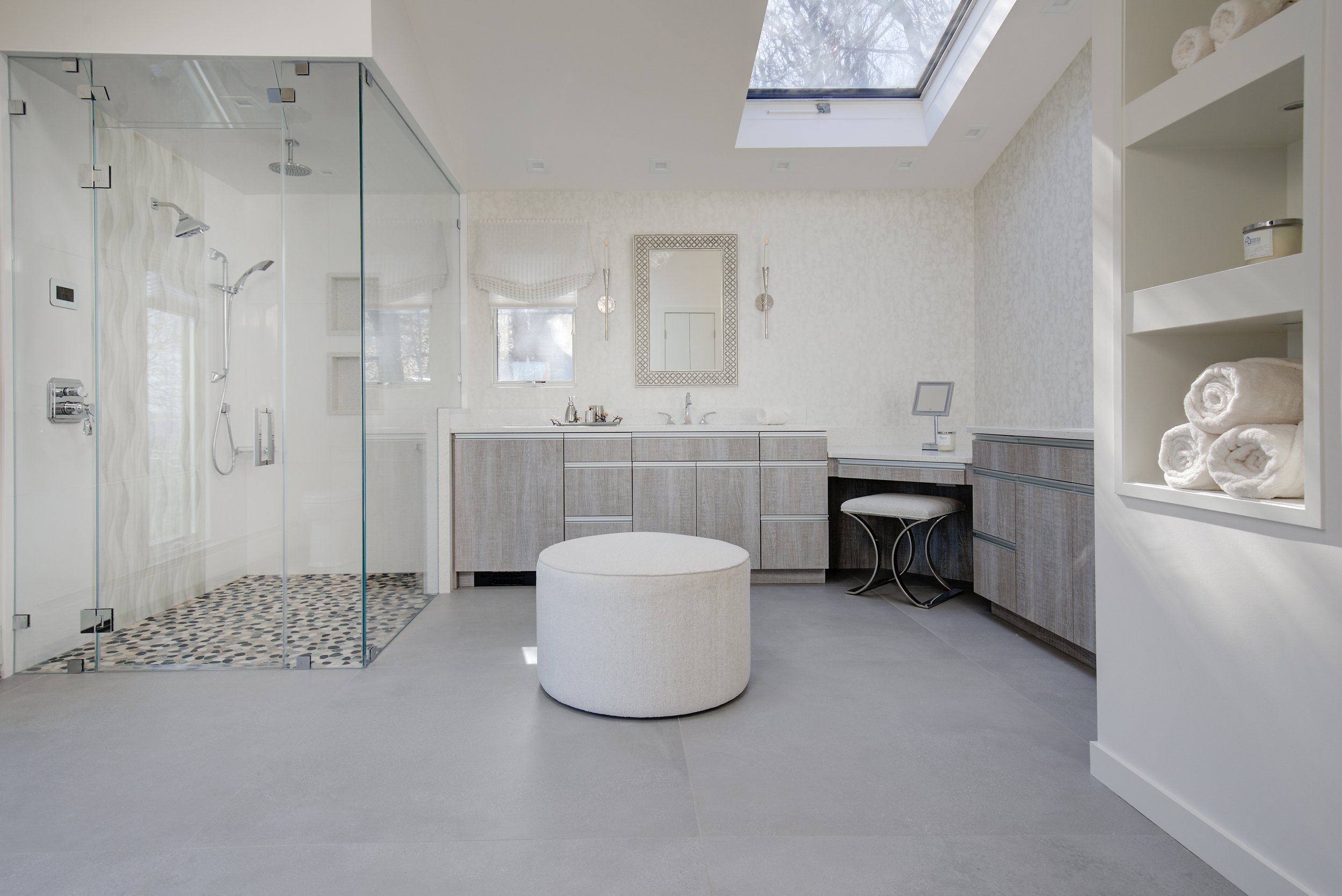 Jaw-dropping views are on display from panoramic windows in almost every room of this Long Island waterfront contemporary home. Originally designed and built by the homeowners in the 80s, the Fire Island Modern vibe had not been touched since then. Though stylish in its day, the jetted tub, platform bed, and Hollywood mirrors were no longer the clients’ taste. We created a soothing spa bath and primary suite, along with a spacious office, all with a natural, fun, and chic feel.