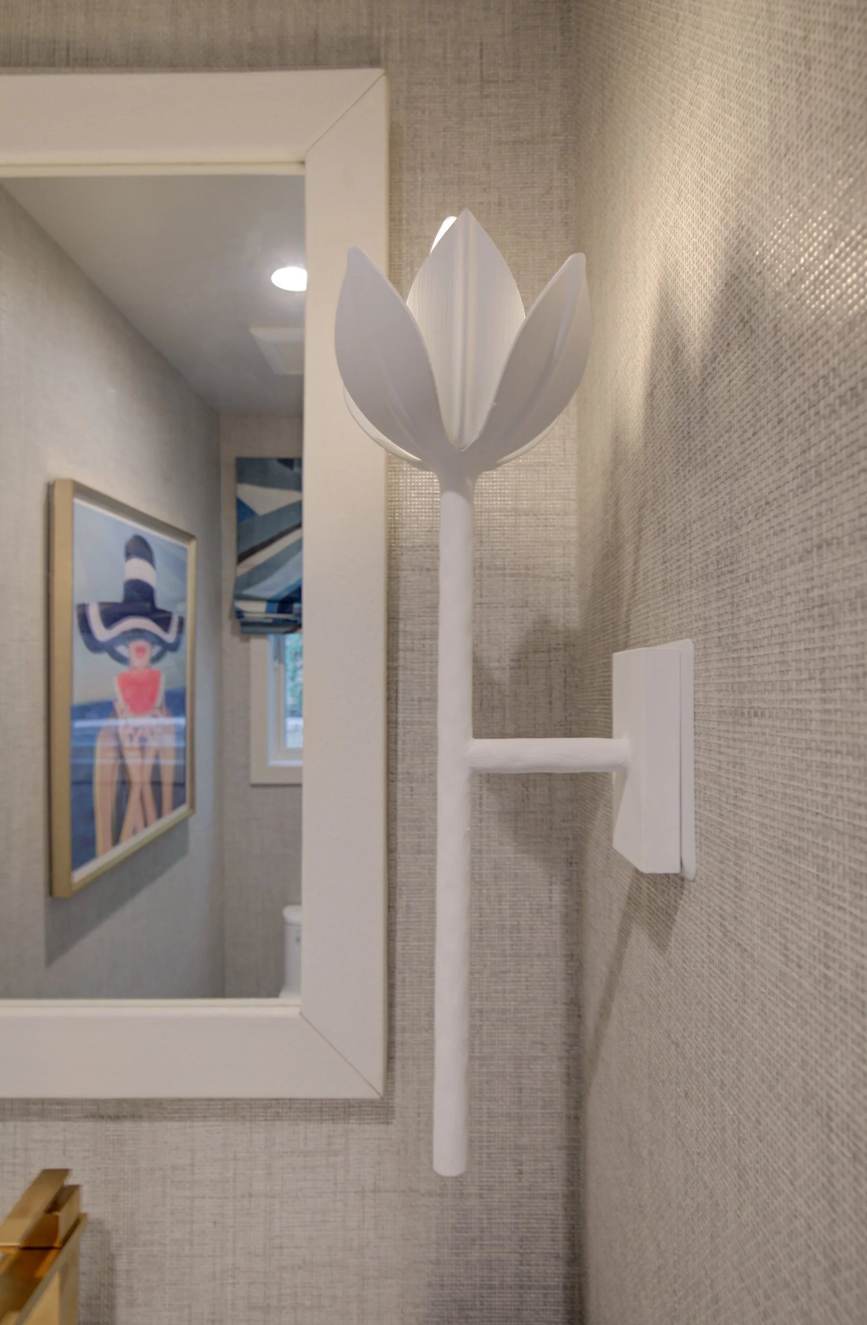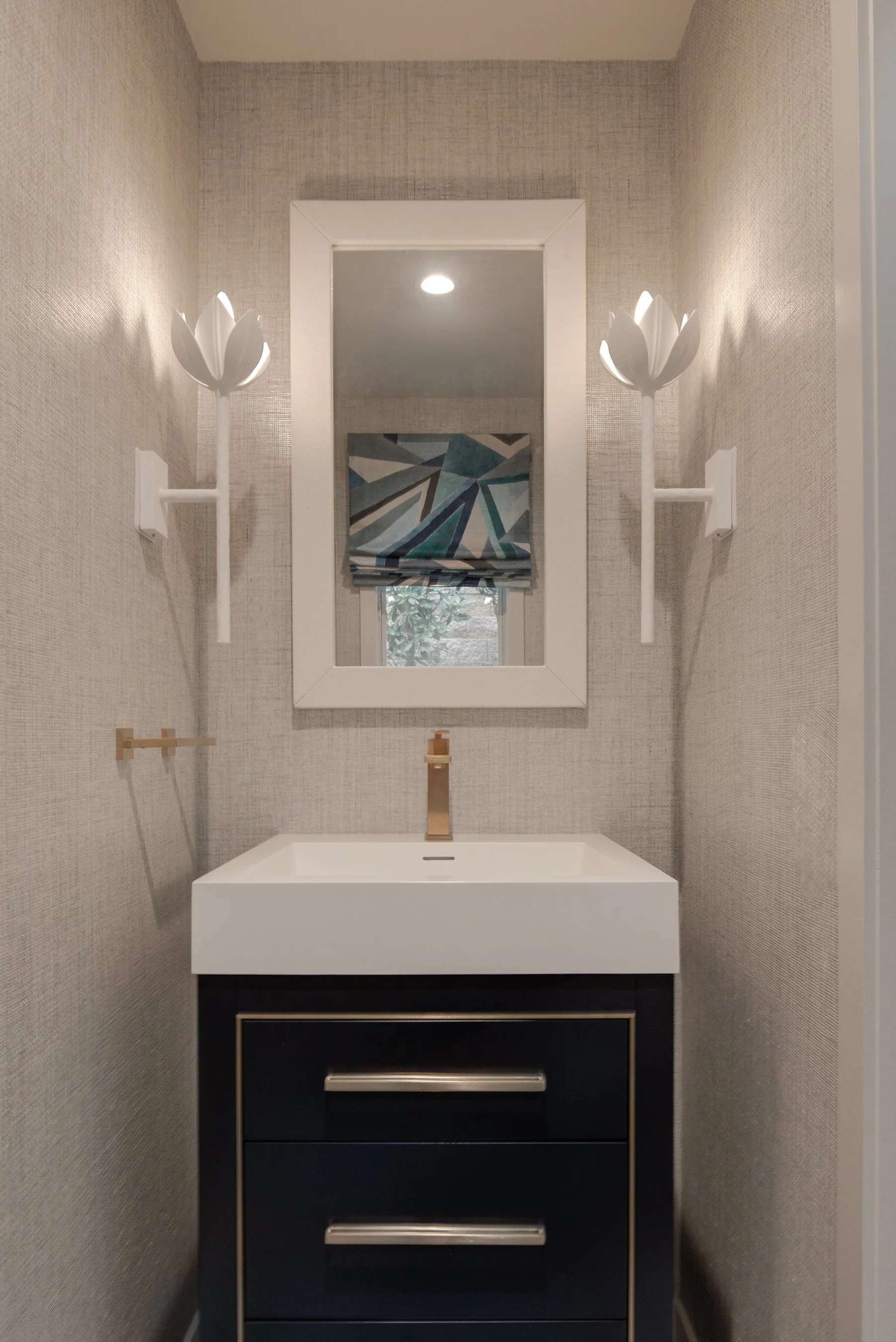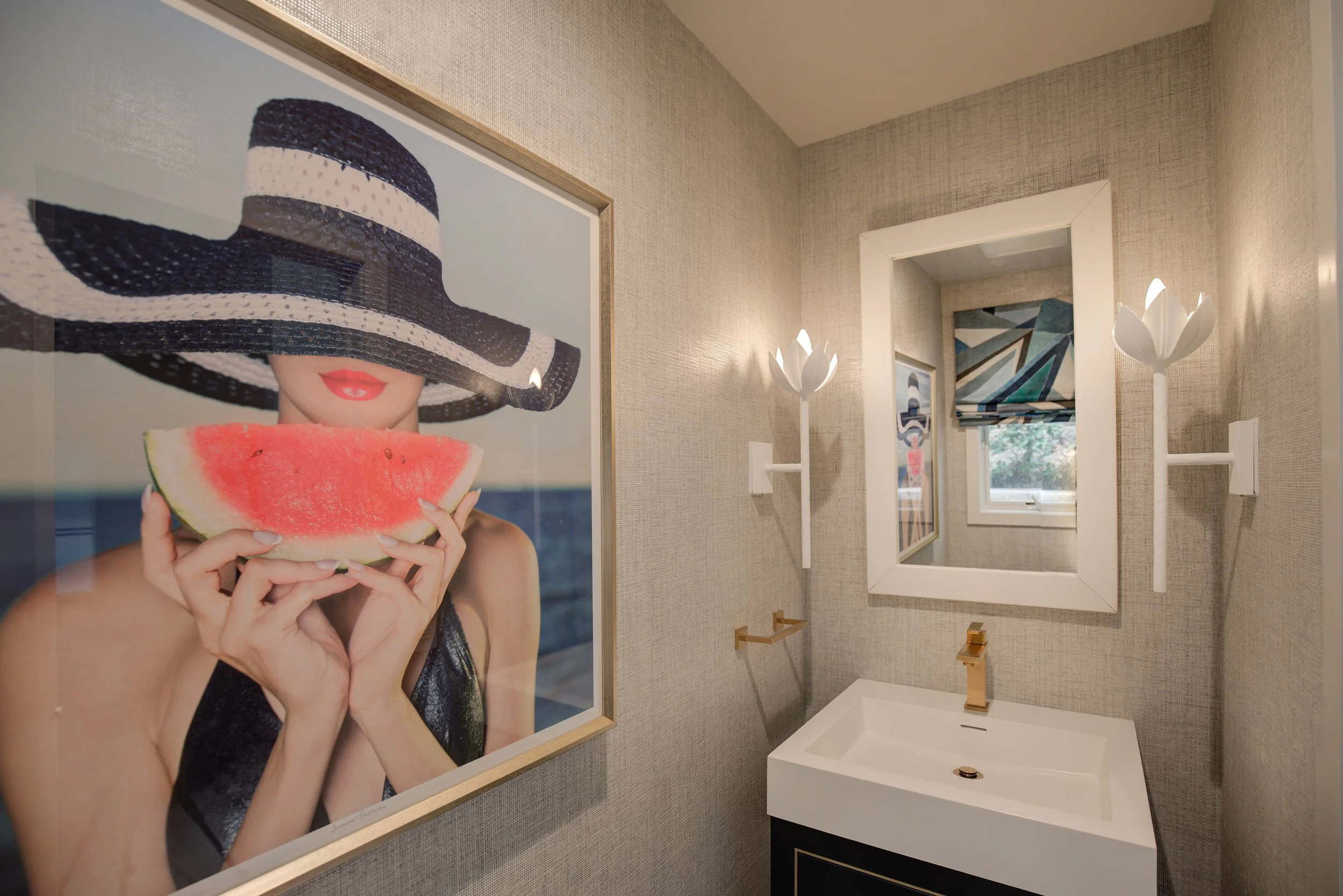We love going fully bold in our clients’ powder rooms, and so here we had tons of fun with our Trowbridge pop art and a chic nod to the beach, and Kravet fabric is the perfect complement for the Roman Shade.