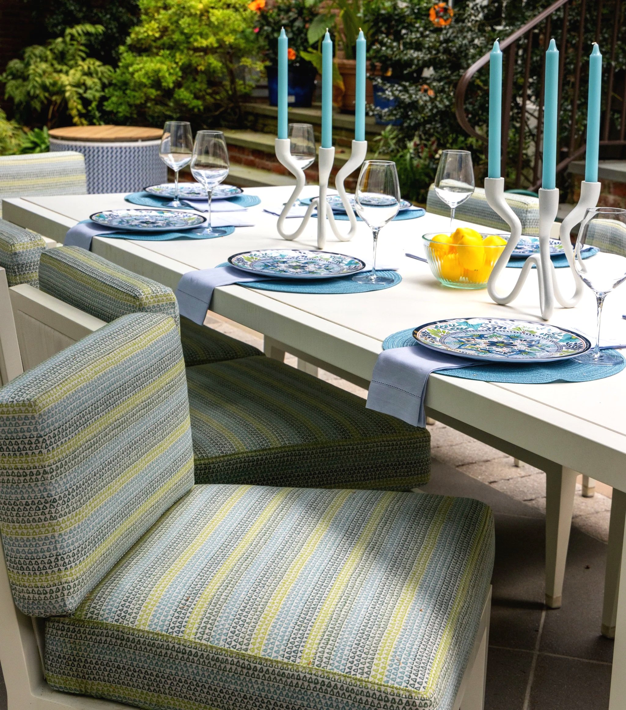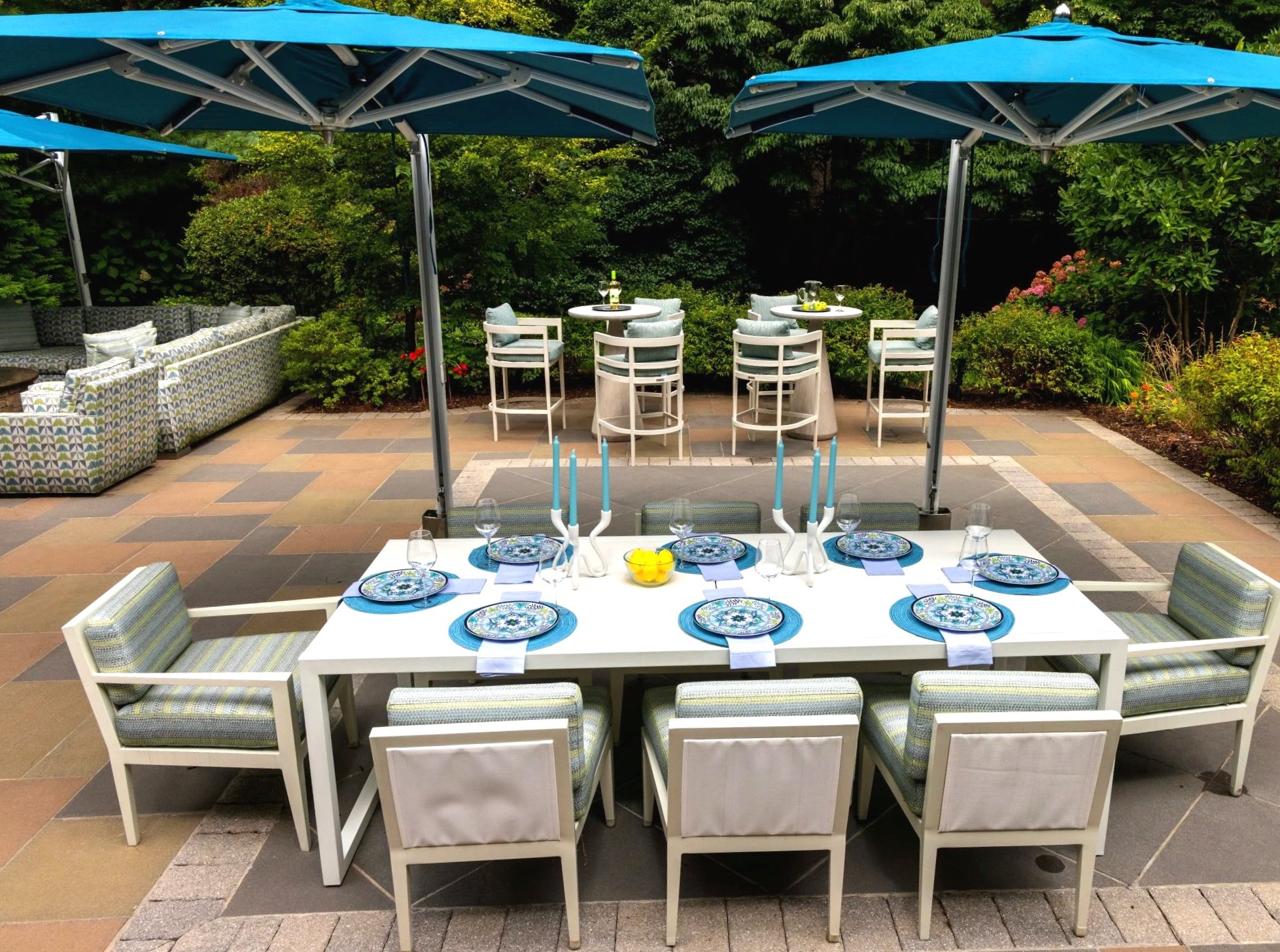 Our clients wanted plenty of space for dining, and no maintenance. No maintenace here — everything is created in soft man-made frames that withstand the elements and are cool to the touch. Our clean lines table expands to fit 14 diners! Barstools are placed at high tops and at the outdoor kitchen counter, so guests can wander with their chardonnay and perch wherever they land.