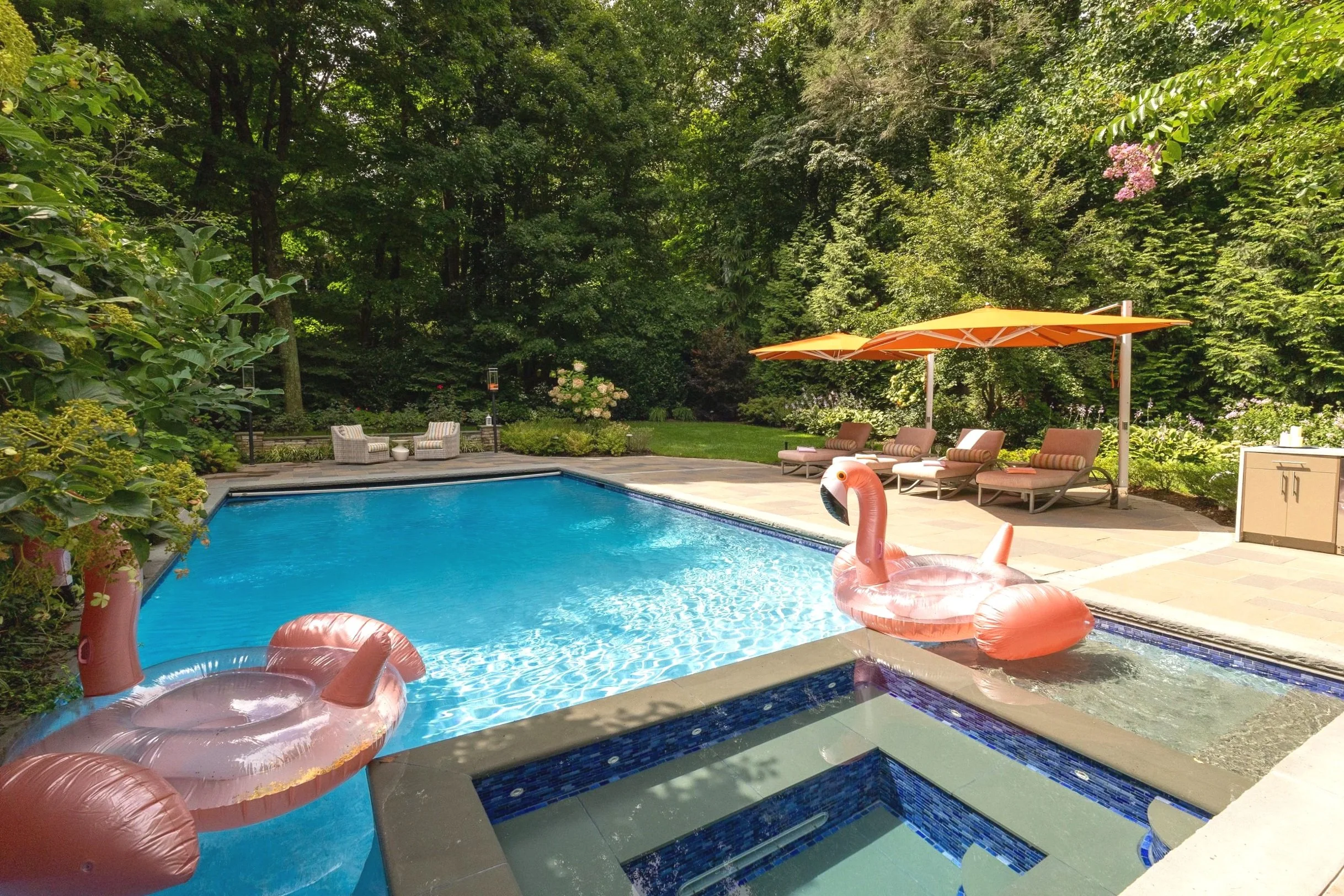 “Let’s entertain in style! We designed a multitude of party zones, including a sectional lounging around an outdoor TV and firepit, high tops and an expandable dining table, all flanked with customized European shade structures and hospitality quality electronic umbrellas.”