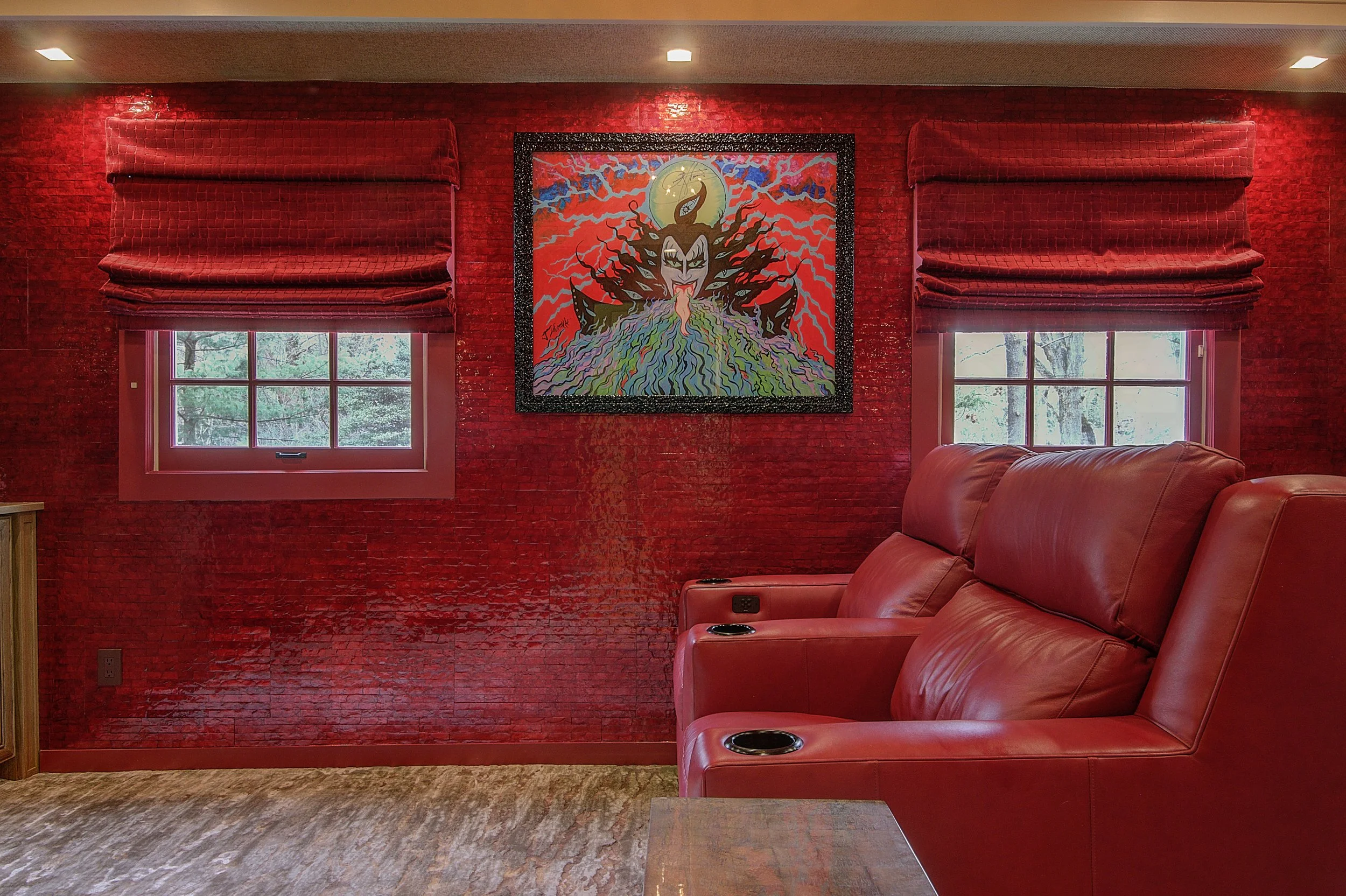 I love design drama and my favorite example of this is the “Red Room.” It’s a media room, where drama is called for, so we really took chances. A bright red mother of pearl wall covering graces one wall (real shells in this absolutely fabulous wall covering from @MayaRomanoff), and a deep red baseball stitched wallpaper graces others. We even kept the client’s colorful and raucous Gene Simmons painting on the wall. Key to creating a bold space is to balance the bold with calm, so I toned this space way down with soft, natural textures of tan grasscloth and walnut cabinetry. Juxtaposition is vital here. Don’t go overboard. Gene does that well enough.