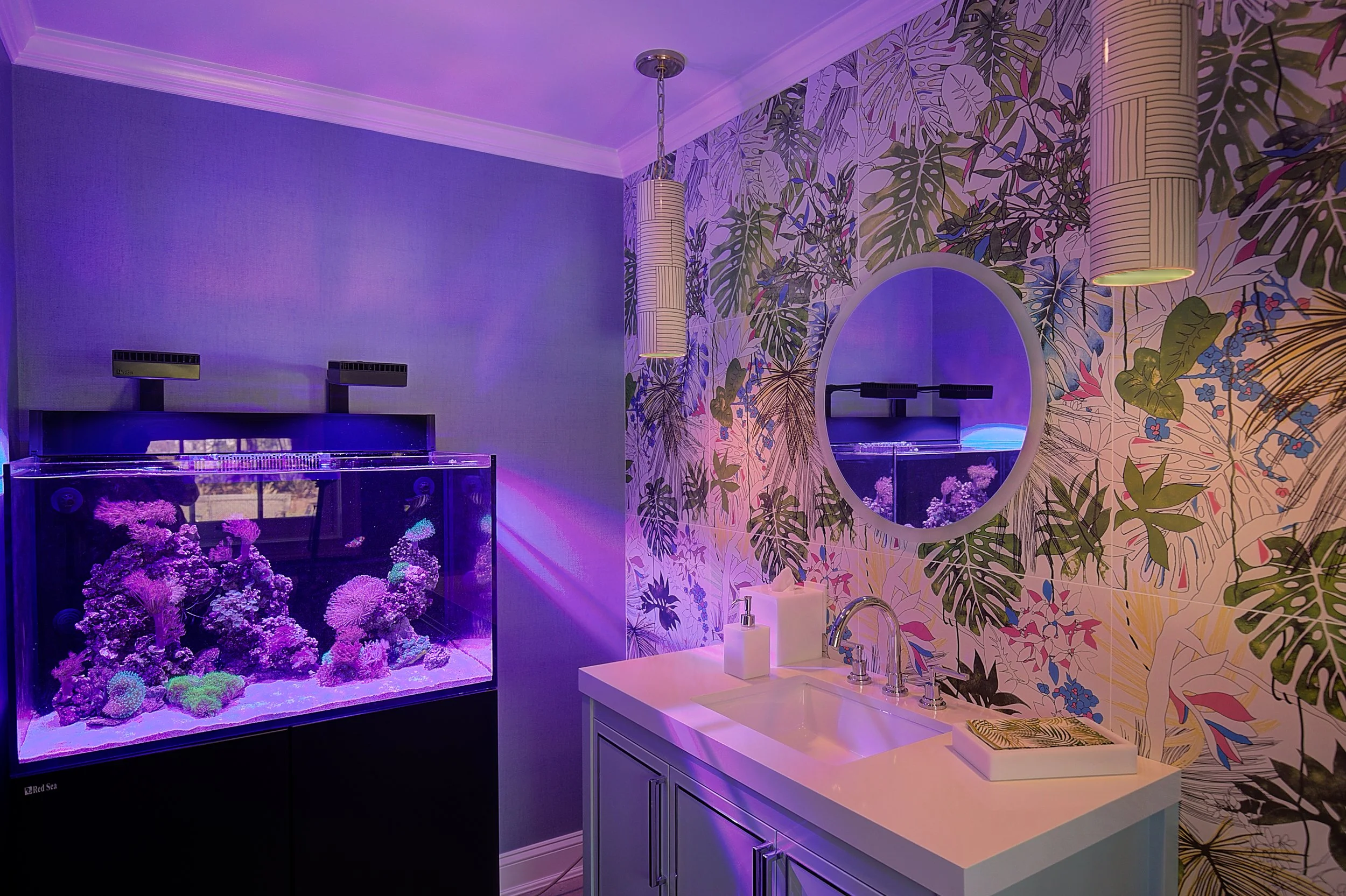 Tropical hues like hot pink and turquoise are some of my favorites, so in this client’s powder room off their pool, we went to town with a large scale, bold tile (yes, it’s tile, not wall covering) wall of a tropical jungle theme. And…we added a tropical fish tank! We are not sleeping or dining in here, so this is a fun place to play with vibrancy, but there is a fine line between fun and tacky, so I kept the durable vinyl wall covering a much more subtle shade of blue. The passionately pink Roman shades are strong enough to tie everything together and balance out the bold tile colors, but they are not screaming Barbie.