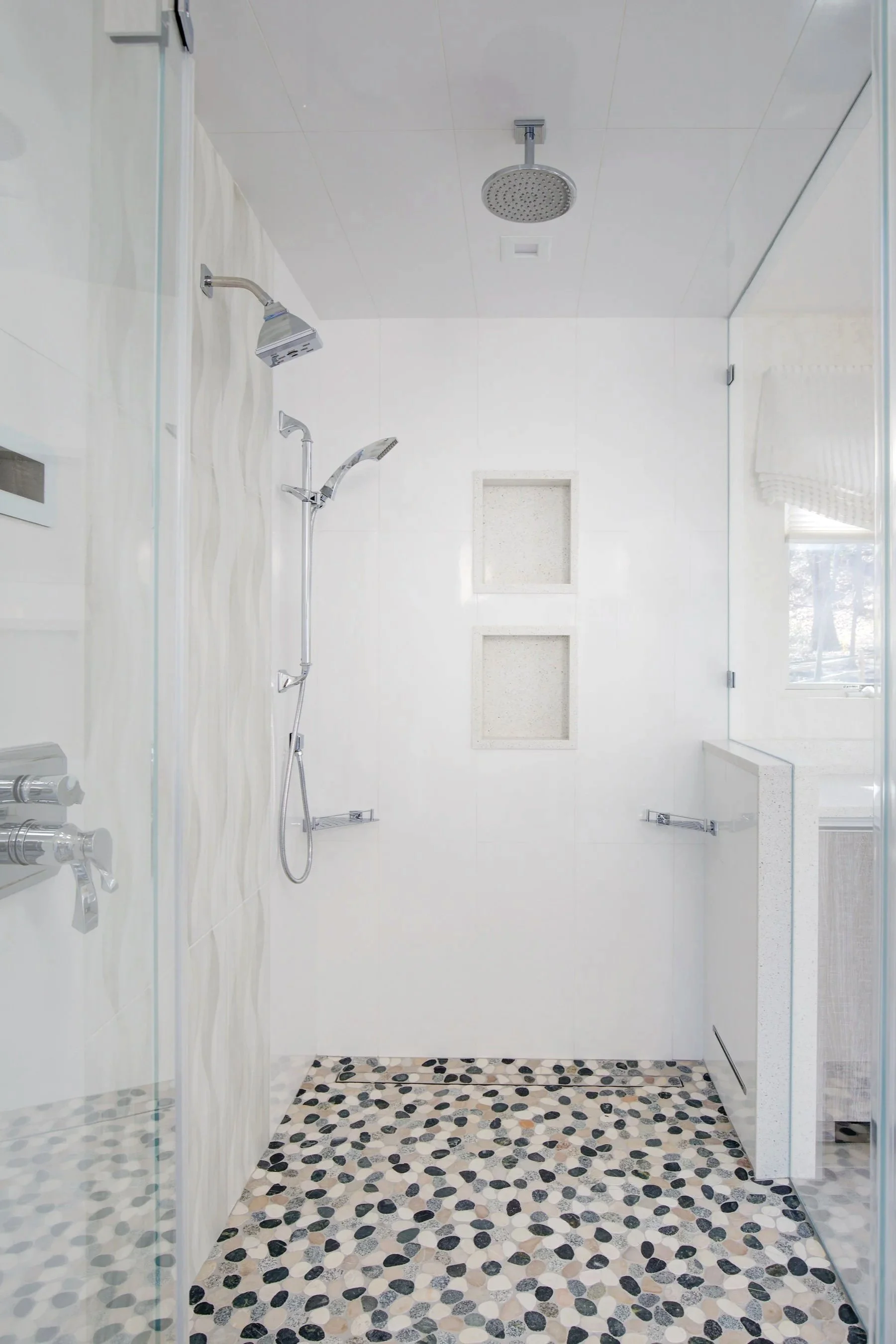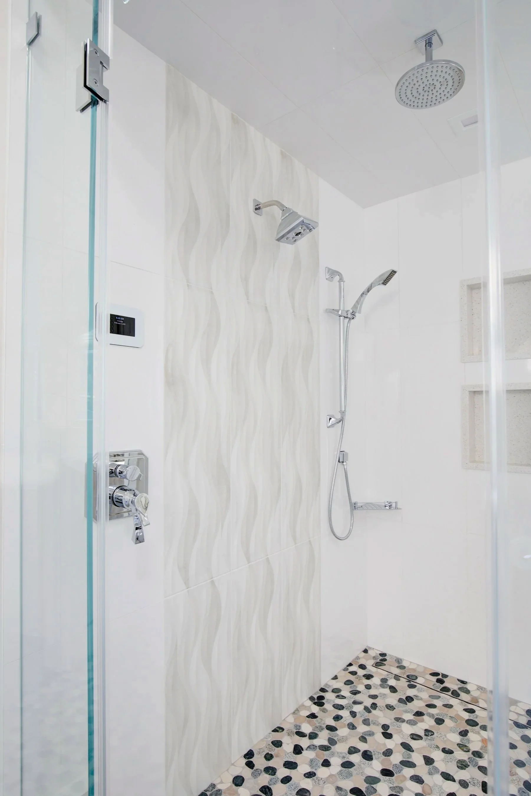There’s a lot to think about here. For large walk-in showers, I locate the shut-off valves close to the shower entrance because no one wants to get wet when turning on the water. The temperature control valves should be located closer to the shower heads.