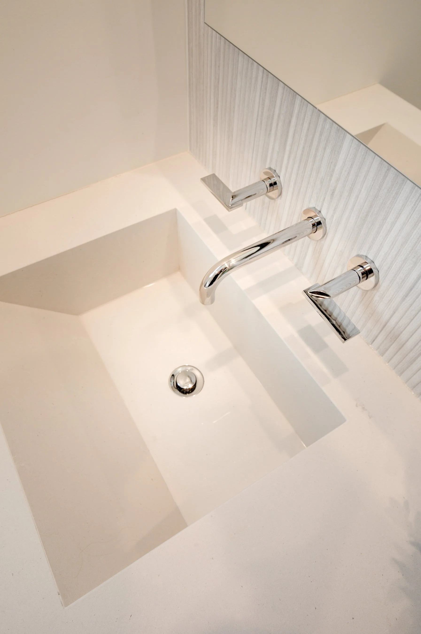 Wall mount faucets provide a clean, contemporary look. I love them for that reason, and also because they make cleanup a breeze. Water always splashes on the counter, right? With wall mounts, you don’t have to wipe around a faucet every time you use the sink. Here’s the snag: Wall mount faucets require a valve and supply lines in the wall, whereas deck mounted supply lines run through the floor (and the valve is in the faucet itself). So, placing a wall mount faucet on an exterior wall is a bad idea in a cold climate. Unless you a. live in Hawaii (please call me if you need a bathroom in Hawaii) or b. can double up on the thickness of your wall, use a deck mounted faucet if your sink is on an exterior wall. One more caveat about wall mounts: to access the valve means needing to get into the wall behind it, so make sure you will be able to get into that wall just in case a repair is needed.
