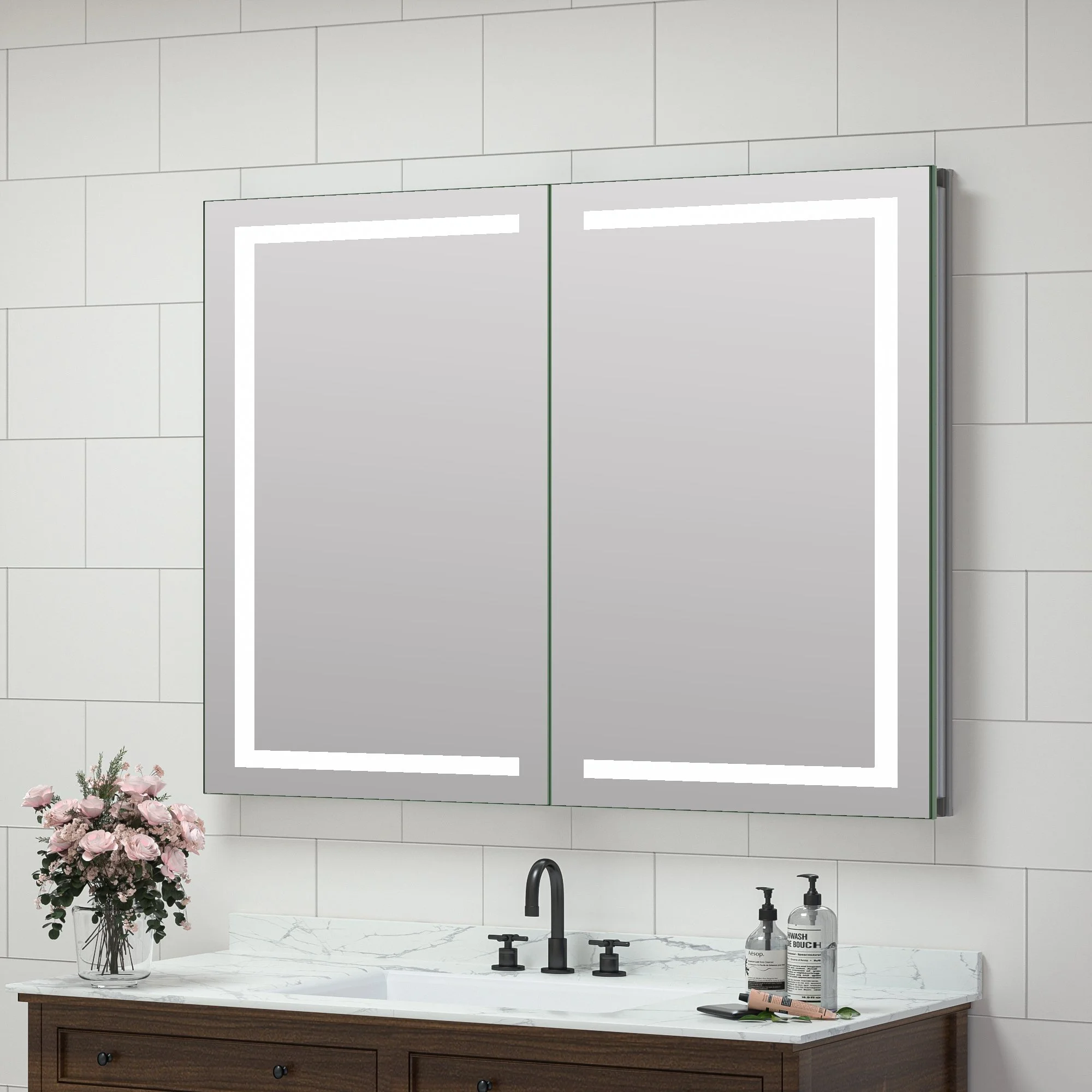 My favorite gorgeous workhorse in a bathroom is a recessed medicine cabinet with plenty of storage, an internal outlet for an electric razor or toothbrush, and a door that is a lit mirror. Think 24 inches wide or more. The entire frame illuminates your face, which means you can really see your makeup or hair before you leave the house. And whatever you do, do not use a small, lit wall mount makeup mirror. A wall mounted makeup mirror that is only 6 or 8 inches wide, when lit, will do nothing but shine light in your eyes so you cannot see anything. If you are doing a lit mirror, go big!