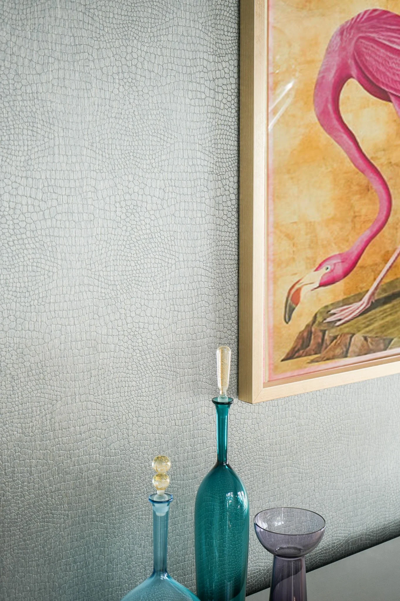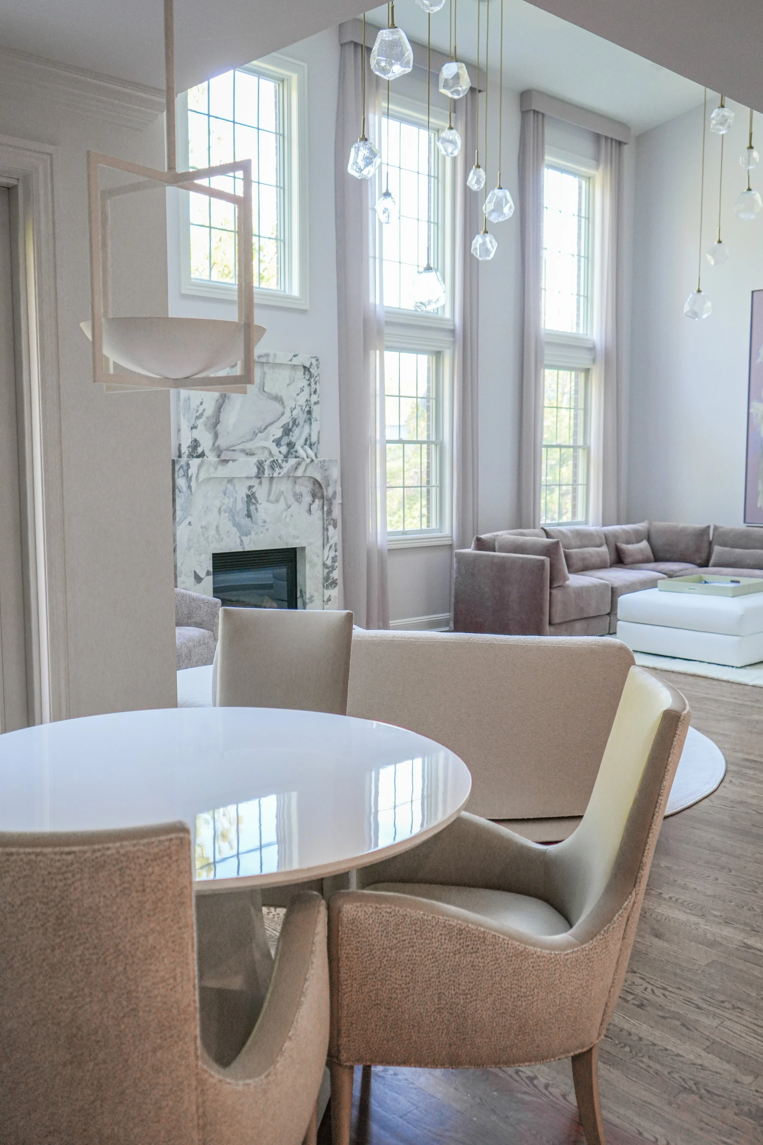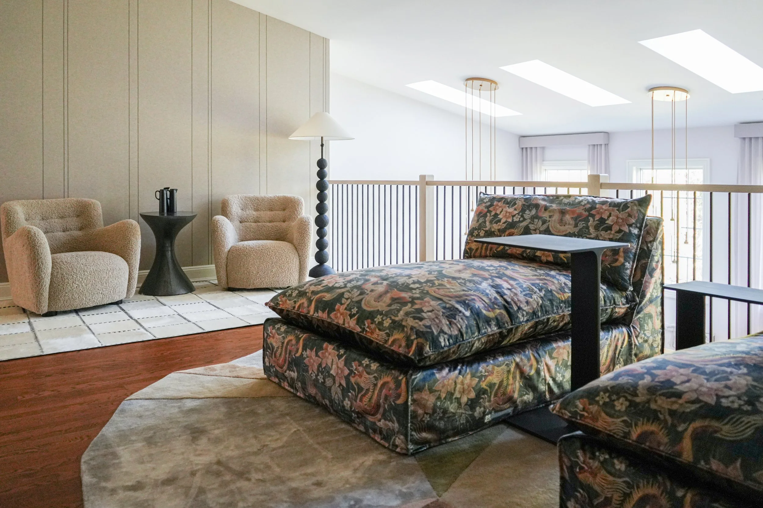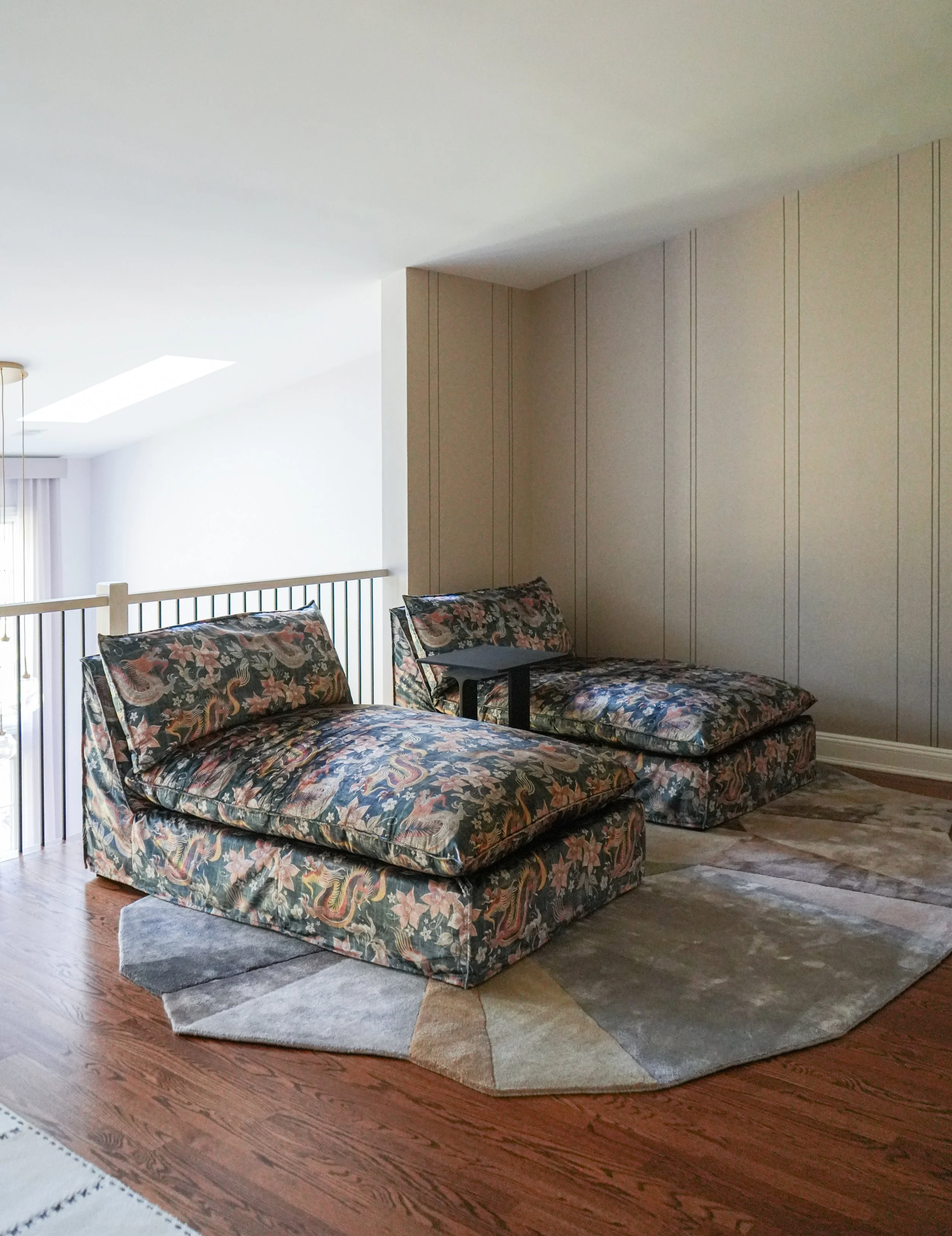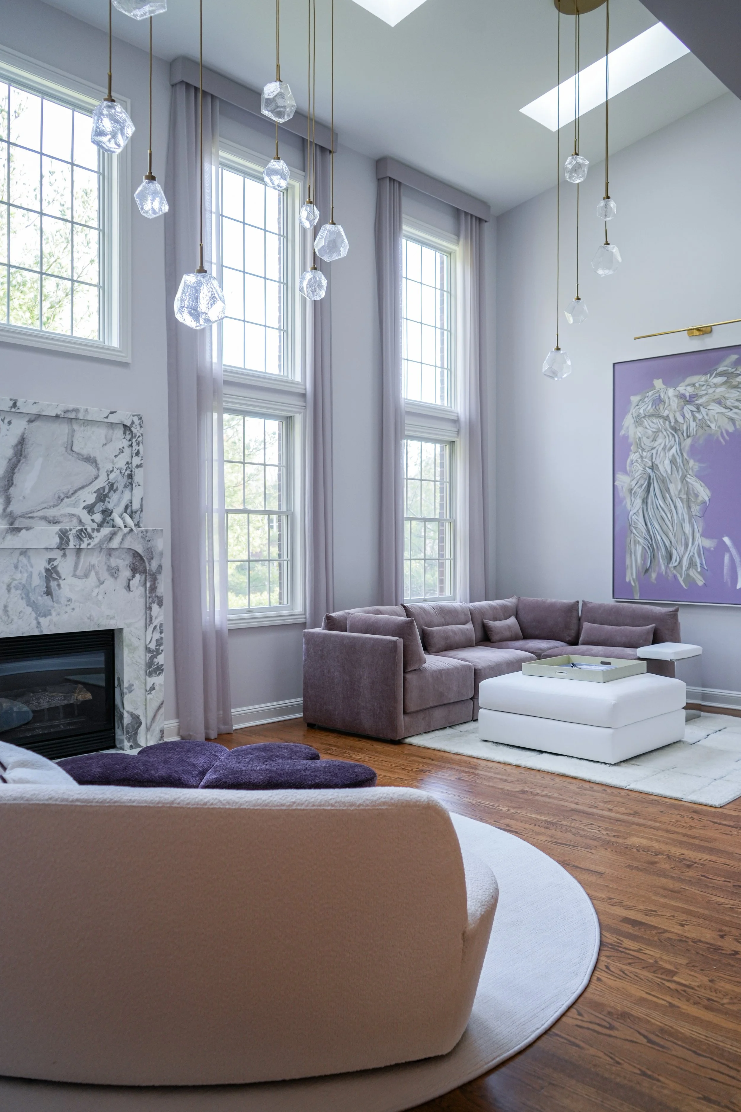 A very special finale for these clients; I know someone was watching over us. At the inception, I chose the heart-shaped ottomans in a rich violet. I designed the hand-carved fireplace surround half a year later, and found a fateful marble in lilac tones. Look closely and tell me if you see the heart — something I’ve never seen in a marble piece before. A meaningful symbol of a fresh and loving start.