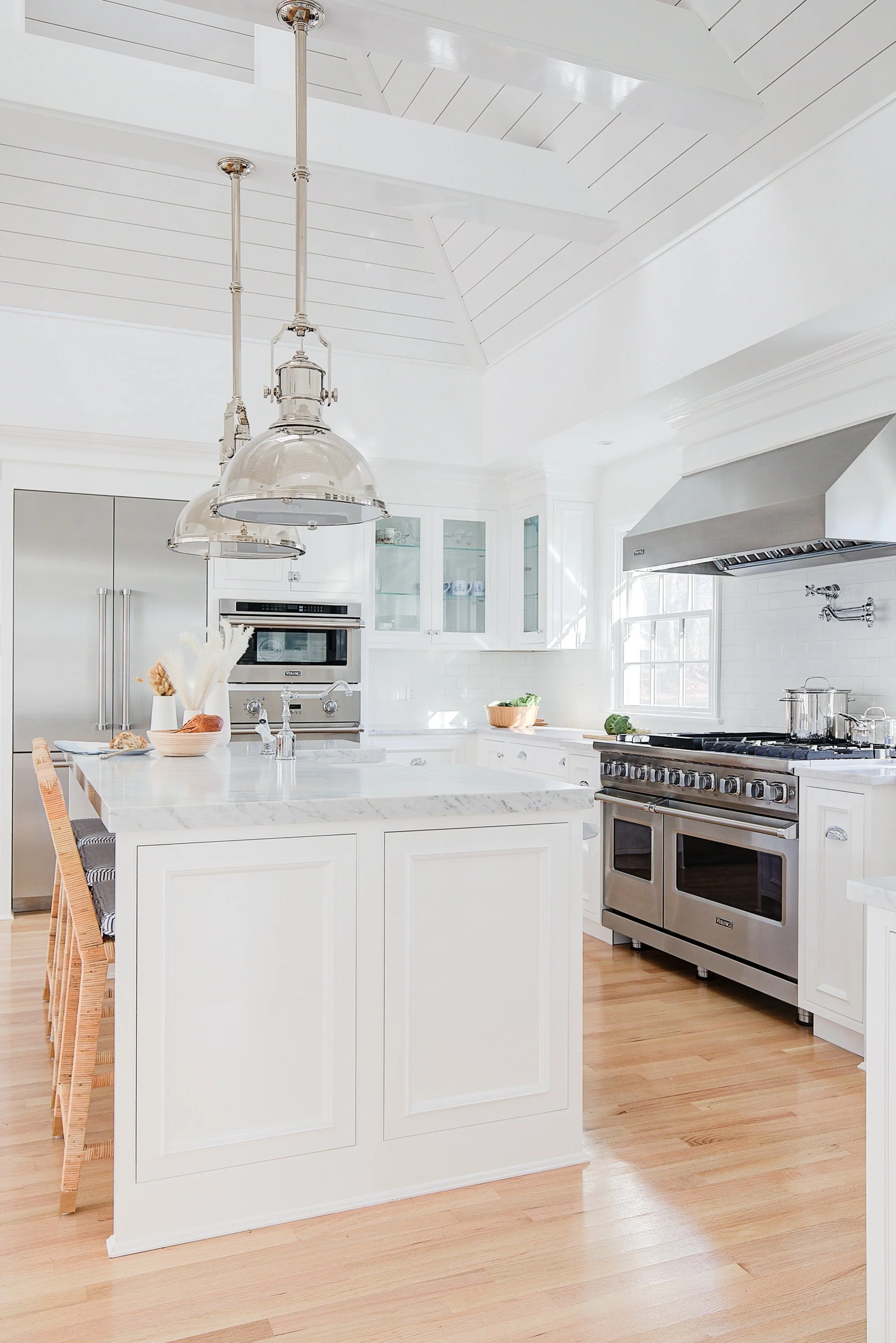 “It was a pleasure to work with Sharon Gunther and the Fresh Design Group team to remodel our 1908 kitchen. The room was opened up to create a large kitchen/family room. The one thing that we kept was the old commercial Garland range, which was the inspiration for the black accents. We wanted to update the kitchen, while nodding at the century plus of meals that this space provided, and especially without pinning the design to any specific period. We are so happy with the great quality of the cabinetry, and absolutely love the quartzite countertops. The great attention to detail, particularly in the tricky corner to the right of the range, marked Sharon's thorough approach to her projects. We highly recommend them! We are using them again, to update an original, very awkward, and leaking bathtub bathroom and adjacent closets and laundry room.”